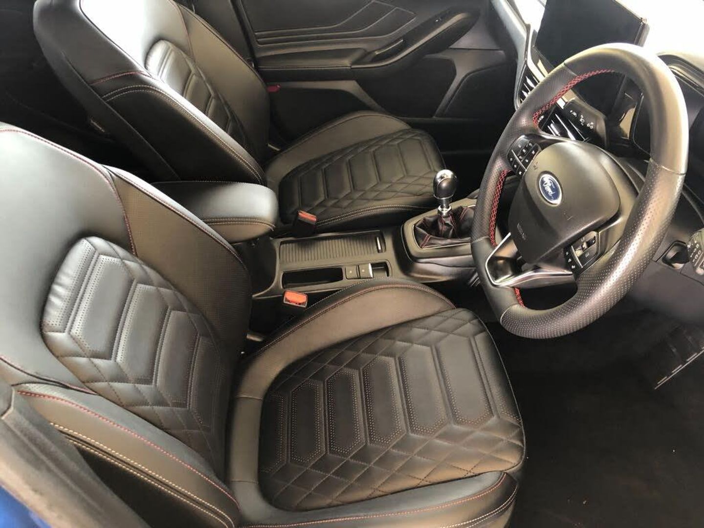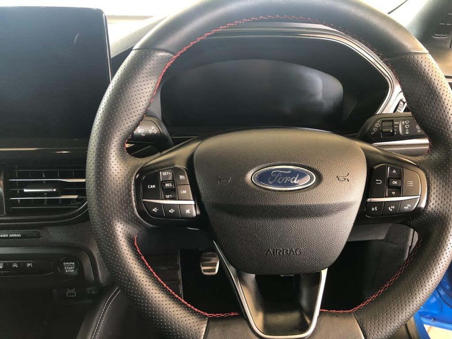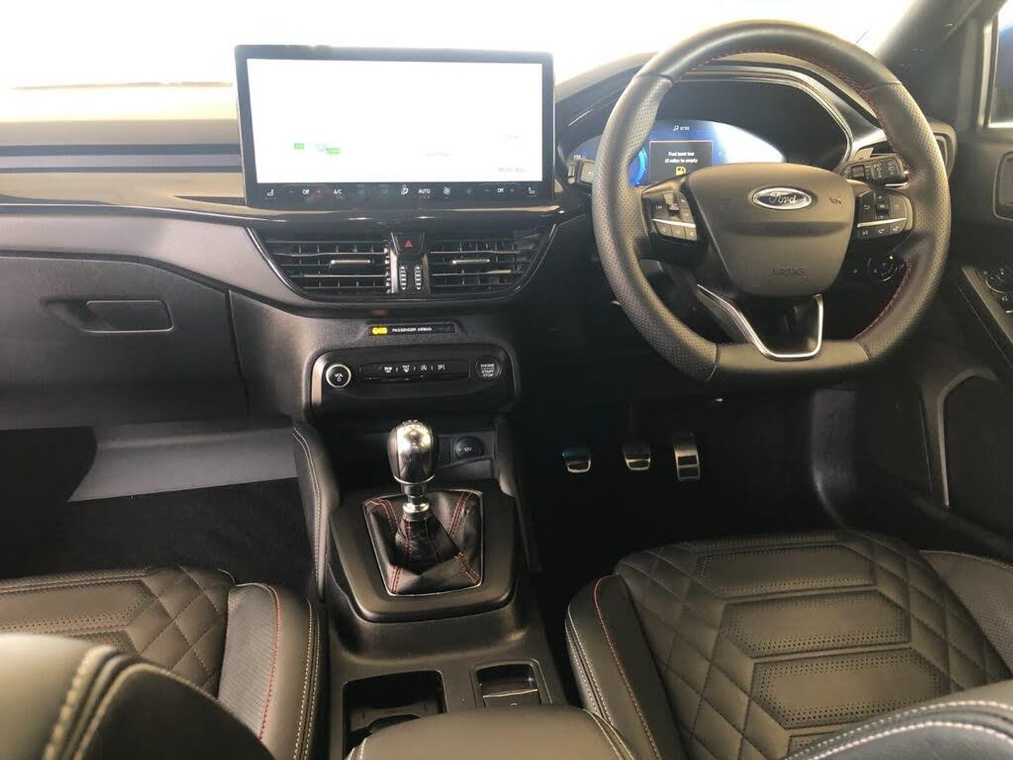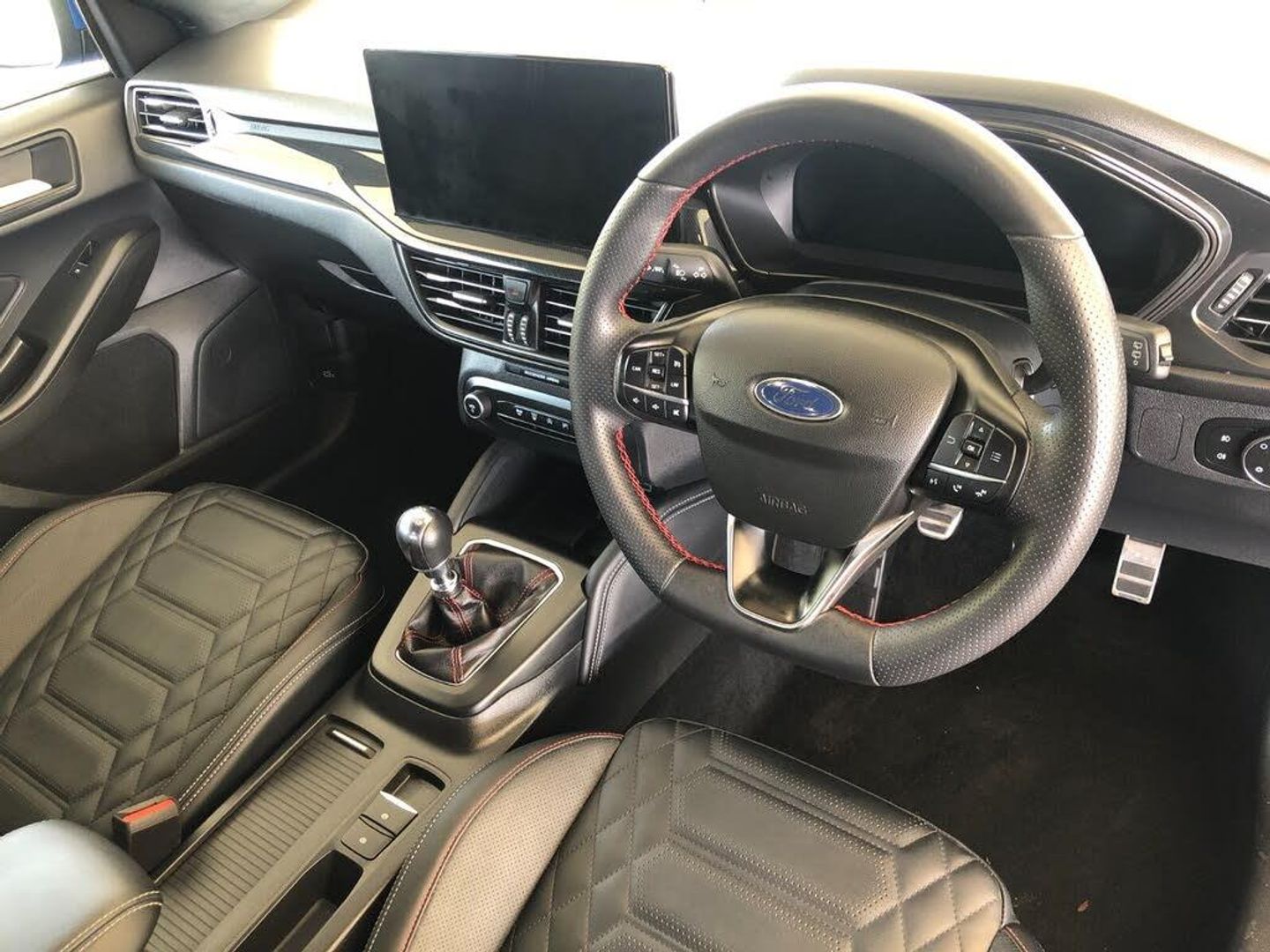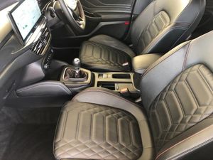 12.3" Digital instrument cluster, Bluetooth system, Digital clock, Easy fuel capless refuelling system, Eco mode, Ford SYNC4 Nav with 13.2'' touchscreen, DAB, Emergency Assistance, Apple Carplay & Android Auto, B&O Premium Audio with 10 speakers, FordPass Connect, Lane keeping system - lane keeping alert and lane keeping aid, PAS, Rev counter, Selectable drive mode, Service interval indicator, Trip computer, Wireless charging pad, Sports tuned suspension, 2 USB ports, Auto headlamps (on/off), Body coloured door handles, Electrically operated front and rear windows with one touch opening and closing, Electrically operated heated power fold door mirrors with puddle lamp with side indicators, Front variable intermittent wipers with electric wash, Heated rear window, LED daytime running lamp, LED rear lamps, LED third brake light, Polished twin tailpipe, Privacy glass, Quickclear heated windscreen, Rain sensor, Rear side wing doors, Tailgate wash/wipe, Unique ST-Line grille, full bodystyling kit, and large body coloured rear spoiler, 3 rear headrests, 3 seat bench in 2nd row, Dual zone electronic air temperature control, Full sensico premium upholstery, Height adjustable front headrests, Isofix child seat preparation, Load through ski hatch, Manual 2-way passenger seat adjust, Power 4-way driver seat adjust, with power lumbar adjust, Reach + rake adjustable steering column, Single front passenger seat, Winter pack - Focus, 3x3 point rear seatbelts, ABS+Electronic Brake force Distribution, Auto hold function, Driver airbag, EDL traction control, Electronic parking brake, Electronic stability control, Front and rear seatbelt reminder, Front inertia reel height adjustable seatbelts with pre-tensioners, Front passenger airbag, Front side airbags, Passenger airbag deactivate switch, Post collision braking, Pre collision assist with autonomous emergency braking and pedestrian/cyclist detection, Red brake calipers, Remote/power child rear door locks, Side curtain airbags, Three rear inertia reel lap/diagonal seatbelts, Tyre pressure monitoring system, Keyless entry and keyless start, MyKey system, Remote central locking & engine immobiliser, Thatcham alarm with power door dead locks, 18" 5x3 spoke pearl grey high gloss machined finish alloy wheels with mini spare wheel