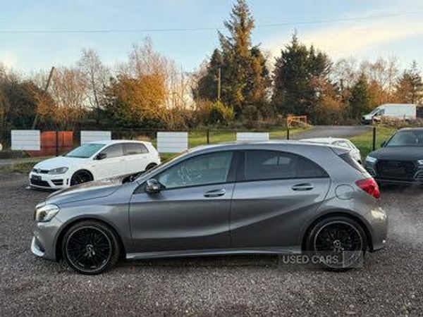 8" colour display screen, Attention assist, Bluetooth interface for hands free telephone, Bulb failure indicator, Collision prevention assist plus, DYNAMIC SELECT with a choice of driving modes (ECO, Comfort, Sport, Sport+ and Individual), External temperature gauge, Low fluid warning light, Park assist pilot with front and rear park assist, Reversing camera, Service indicator (ASSYST PLUS), Speed dependent sports steering system, Trip computer, USB port, Adaptive brake lights, AMG body styling, Auto dimming driver's door mirror, Auto dimming rear view mirror, Body colour bumpers, Body colour door handles, Body colour side skirt, Daytime running lights, Diamond radiator grille with chrome pins and silver louvre + chrome insert, Electric adjustable heated door mirrors, Electric folding door mirrors, Electric front windows, Electric rear windows, Headlamp assist, Heated rear window with timer, High beam assist, LED Headlights, Rain sensor windscreen wipers, Rear wiper, Twin Trapezoidal tailpipes, 1/3 to 2/3 split folding rear seats, 12 colour Ambient lighting, 12V socket, 3 Spoke sports multifunction flat bottomed leather steering wheel, Auto Mercedes-Benz child seat recognition sensor, Black headlining, Brushed stainless steel sports pedals, Dual zone automatic climate control, Footwell lights, Front and rear reading lights, Front centre armrest with storage compartment, Front head restraints, Front sport seats, Gearshift paddles on steering wheel, Heated front seats, Height adjustable front seats, Height/reach adjustable steering column, Illuminated door sills, Illuminated glovebox, Illuminated storage compartment, Isofix rear child seat preparation, Load securing rings in luggage compartment, Luggage compartment cover, Luggage net under rear parcel shelf, Parcel net in front passenger footwell, Rear head restraints, Storage compartment under load area floor, Sunvisors with illuminated vanity mirrors, Twin front cupholders, Seat comfort pack - A Class, Stowage Pack - A Class, 3 rear 3 point seatbelts, ABS with Brake Assist, Active bonnet, Adaptive brake system, Brake calipers with Mercedes-Benz lettering + perforated brake discs, Child proof door locks, Crash responsive emergency lighting, Drivers knee airbag, Dual stage Driver/Passenger Airbags, Electronic parking brake, ESP with ASR, Front and rear seatbelt reminder, Front head airbags, Front passenger seat occupancy sensor, Front side airbags, Hill start assist, Tyre pressure monitoring system, Warning triangle and first aid kit, Window airbags, Alarm system/interior protection/immobiliser, Keyless ignition, Remote central locking, Lowered suspension, Carbon effect trim, Chrome air vent surrounds, Tirefit sealant with electric air pump