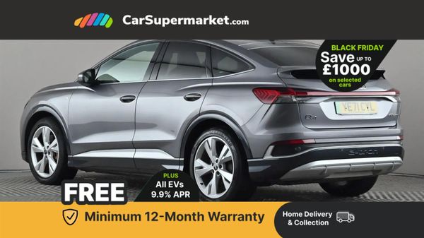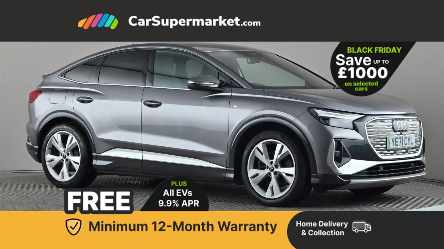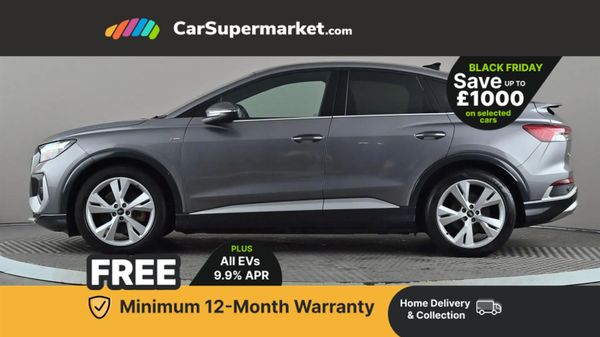 Audi connect safety and service (e-call),Audi drive select,Audi Smartphone Interface with wireless functionality,Audi Virtual Cockpit - 10.25" display,Bluetooth interface,Camera based traffic sign recognition,Lane departure warning system,MMI Navigation Plus with high resolution 10.1 inch touchscreen colour display,Power operated tailgate,Progressive steering,Swerve assist and turn assist,11KW onboard charger,125kW DC charging capability,AC and DC charging access point positioned on the rear right,Compact e-tron charging system,Household plug type G (GB),Industry plug CEE 32 A/230 V/6 h/long + straight,Mode 3 AC charging cable 22 kW,2 USB-C ports with charge and data functions,Audi sound system with 8 speakers,DAB Digital radio,Acoustic glass windscreen,Body coloured door mirrors,Contrast bumpers in Manhattan grey,Driver's door mirror memory,Electrically adjustable/heated/folding/auto dimming door mirrors with integrated LED indications + kerb view function for passenger side,Frameless auto dimming interior rear view mirror,LED daytime running lights,Projection light in the exterior mirrors, e-tron logo projected from the underside of the exterior mirror onto the ground,S line badges on front wings,S line exterior styling,Side and rear window privacy glass,Single frame grille with a structured, closed surface within an octagonal shape,3 zone automatic air conditioning,4 way electric lumbar support for driver and front passenger,40:60 Split folding rear seat or folded fully,Accent surfaces in gloss black - centre console control panel, switch panel and trim on front doors in gloss black,Auxiliary air conditioning,Black cloth headlining,Comfort front centre armrest,Driver/passenger manual seat height adjustment,Front and rear head restraints,Front door sill trims with aluminium inlay, illuminated with S logo,Heated front seats,Stainless steel pedals,Gloss styling pack - Q4 E-tron,Non smoking pack - Q4 E-tron,3x3 point rear seatbelts,Active vehicle alerting system (AVAS),Driver and front passenger airbag with passenger airbag deactivation,Electric child locks,Front side airbags with head airbags and interaction airbag,Pre-sense front with pedestrian and cyclist detection,Seatbelt warning,Tyre pressure loss indicator,Warning triangle and first aid kit,Anti theft alarm,Anti-theft wheel bolts,Keyless Go,Aluminium look interior elements,Inlay in dark matt brushed aluminium, accent surfaces on instrument panel and centre console trim in chrome paint finish, slate grey,Tool kit,Tyre repair kit