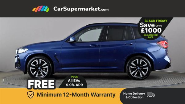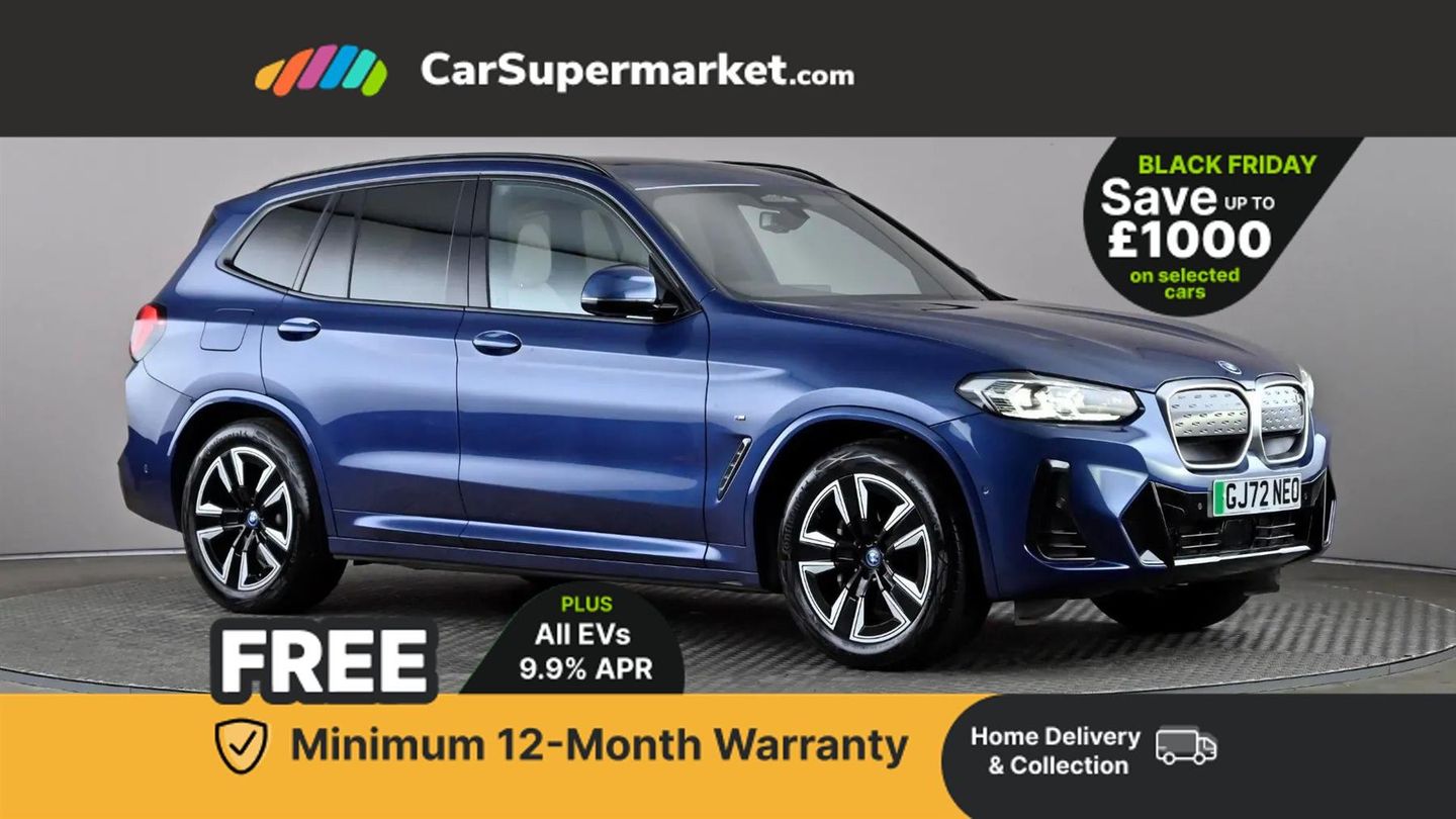 Active guard plus incl speed limit assist, lane departure warning with steering impulse and front collision warning with brake intervention,Apple car play and Android auto,Attentiveness assist,Automatic tailgate operation with remote opening and closing by key, opening distance adjustable with iDrive controller,BMW iDrive,BMW Live Cockpit Professional with 12.3" instrument display + 12.3" high resolution centre display nav function and Intelligent Voice Assistant,BMW Online services,BMW Teleservices,Brake pad wear indicator,Check control system,Condition based service - BMW service history, electronic service booklet, integrated owner's handbook,ConnectedDrive Services,Cruise control with brake function + speed limiter,Driving experience switch,Enhanced bluetooth with wireless charging,Front/rear Parking distance control,Language version English,Lateral parking aid,Parking assistant,PAS,Personal Profile,Reversing assistant,Reversing camera,Run flat indicator,Servotronic system,Start/stop button in blue,Wi-Fi hotspot,Widescreen display,Double joint spring strut front axle,eDrive exterior sound,Gear selector switch with toggle operation,Mode 2 flexible charger,Mode 3 charging cable 22kW,Multiple control arm rear axle,Safety battery terminal clamp,2x USB sockets in front,DAB radio,Stereo speaker system with 6 speakers,Air breathers with BMW i logo,Automatic headlights,Blue ring around BMW logos,BMW i badge on the kidney grille,BMW Individual high gloss shadow line with extended contents,Body colour door handles,Body coloured bumpers,Chrome kidney frame,Dynamic brake lights,Electric windows with trap release and convenient opening/closing feature,Exterior mirror housing finished in body colour,Exterior mirrors electrically adjustable, foldable, heated with memory, auto-dimming drivers side and aspherical on passengers side,Follow me home headlight function,Front and rear bumper system with replaceable deformation elements,Full LED rear lights,Green tinted heat protection glazing glass,Headlight beam throw control,Heated washer jets,High beam assistant,High gloss black shadow line roof rails,High gloss shadowline exterior trim,Integrated direction indicators,LED third brake light,M aerodynamic exterior,M badging on the front side (left and right),M design rear apron with high-gloss black inlays with Frozen grey trim panel,M Sport entry door sill strips,M Sport front bumper with iX3 specific design with blue contents,Metallic paint,Mirror base in black matt,Model logo on left tailgate,Model specific design elements - Frozen grey decorative elements and pearl chrome decorative strip,Panoramic glass sunroof, two parts, electric actuation, sliding function, wind deflector, sun protection with floating headliner,Rain sensor and automatic driving lights control,Rear diffuser in Blue,Rear side wing doors,Rear wiper,Reversing light,Sun protection glass,Visible VIN plate,Welcome lighting,12V power socket in front centre console,2 cupholders in front centre console,3 zone automatic air conditioning,40:20:40 split folding 3 bench rear seats in 2nd row,6 pre-defined selectable light designs in various colours with contour and ambient lighting,Ambient centre stack lighting,Ambient instrument panel lighting,Ambient light design projected onto the left and right entering and exiting area,Anthracite headlining,Blue accent around the logo on the steering wheel,Centre console storage tray,Contour lighting front and rear door trim panel,Driver and front passenger heated seats,Driver seat backrest width adjustment,Driver/passenger sunvisors with ticket holders + vanity mirrors,Front and rear ambient footwell lighting,Front and rear door pockets with bottle holders,Front and rear headrests,Front armrest integrated in door trim with centre console includes storage compartment,Front Sports electric seats with Driver's side electric backrest width adjustment and memory,Glove compartment,Heated steering wheel,Height and length steering column adjustment,Isofix rear child seat preparation,Lashing eyelets in luggage compartment,LED ambient lighting,Luggage compartment lighting,Luggage net,M sport leather steering wheel,Multifunctional sport seats for driver and front passenger,Presetting of ambient lighting in BMW iblue,Rear centre armrest with 2 cupholders,Seat backrest adjustment for rear seat,Single front passenger seat,Vernasca leather upholstery,Connected pro pack - iX3,Driving assistant professional package - iX3,Extended storage pack - iX3,Interior and exterior mirror pack - iX3,Non-smoker package,ABS/EBD,Active protection,Airbags - driver and front passenger,BMW emergency call,Brake energy regeneration,Child proof locking system in rear door,Cornering brake control (CBC),Crash sensor - Activation of airbags, hazard warning lights, battery safety cut-off and interior lighting + deactivation of fuel pump,Driver and passenger side airbags,DSTC-Dynamic Stability and Traction Control,Electromechanical parking brake