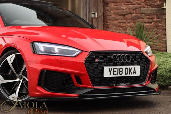 19in Alloy Wheels - 10-Spoke-Star Design Forged in Silver, 6-Airbag System, ABS - Anti-Lock Braking System, Anti-Theft Alarm, Audi Connect Infotainment Services - 36 Month Trial, Audi Connect Safety and Service, Audi Side Assist, Audi Smartphone Interface, Audi Sound System, Audi Virtual Cockpit, Auto-Dimming Rear-View Mirror, Cloth Headlining in Black, DAB Digital Radio Reception, Deluxe 3-Zone Electronic Climate Control, Door Mirrors - Electrically Folding - Adjustable and Heated with Integrated LED Side Indicators and Kerb-view Function for Passenger Side, Door Mirrors - Matt Aluminium Look Housings, Door Sill Trims - Illuminated with RS5 Logo, Electric Windows - Front, Electrically Adjustable Front Seats, Electromechanical Power Steering, First Aid Kit and Warning Triangle, Flat-Bottomed High Multi-function 3-Spoke Leather Sport Steering Wheel with RS Badging, Front Centre Armrest, Front and Rear Floor Mats, Heated Front Seats, High-Beam Assist, Hill Hold Assist, Inlays - Aluminium Race, LED Headlights with LED Rear Lights and Dynamic Rear Indicators, LED Interior Light Package, Leather Door Armrests and Knee Pad, Lumbar Support - Pneumatically Adjustable with Massage Function, MMI Navigation Plus including MMI Touch, Multi Collision Brake Assist, Pedals and Footrest - Stainless Steel, Pop-Up Bonnet for Pedestrian Protection, Pre-Sense City, RS Audi Drive Select, RS Body Styling, RS Exhaust System, RS Sports Suspension, RS-Specific Gear Lever Knob in Perforated Leather with Contrast Stitching, Remote Control Key with RS Emblem, Seat Belt Monitoring, Space Saver Spare Wheel, Split-Folding 2-Seater Rear Seat Bench in 3 Parts - 40-20-40 with Rear Centre Armrest, Tool Kit and Car Jack, Windscreen with Acoustic Glazing, quattro with Sports Differential, Black Styling Package, Inlays - Carbon, Comfort and Sound Package, Extended LED Interior Lighting Package - Multi-Coloured, RS Sports Exhaust System, Privacy Glass, 20in Alloy Wheels - 5-Arm-trapezoid Design Forged in Anthracite Black - Diamond Cut Finish