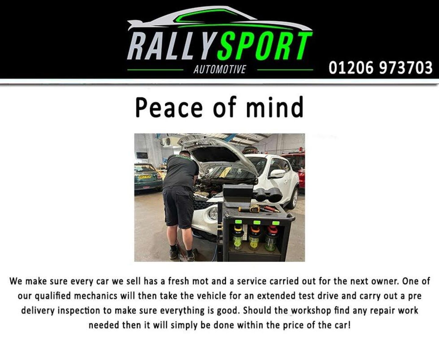 A mechanic will then take the car for a test drive, and any repair work found will be done within the price. You get peace of mind with our comprehensive in house warranty. We cover items that are normally excluded by age or wear & tear like clutches, brakes etc. You also get free MOT tests for life.