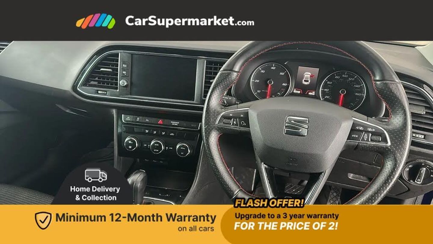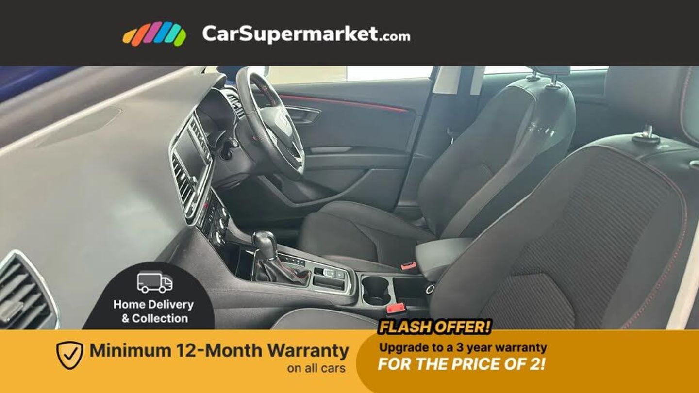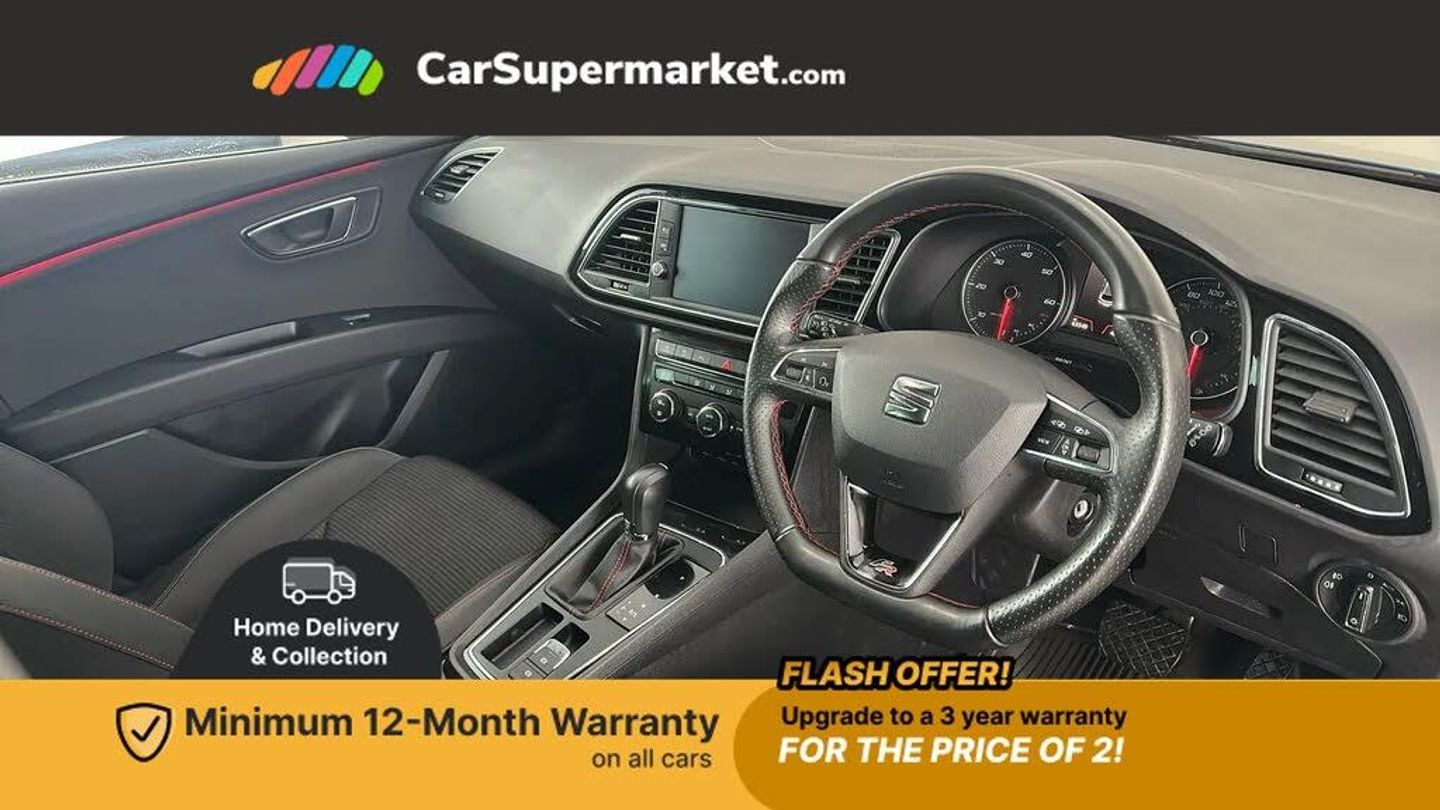 Electro-mechanical power steering,Front and rear parking sensors,Front assist with pedestrian protection,Full Link Smartphone Integration with Mirror Link, Apple Car Play, Google Android Auto with USB Type C cable for Apple and Android compatibility,Media system plus with 8" display, 4 USB, 8 speakers, CD, voice control, DAB, bluetooth and handsfree, steering wheel mounted audio and phone control,Navigation system 3D map display, high resolution colour driver display, two SD card slots,RPM, trip computer, outside temp gauge, instrument light brightness, low fuel warning light, lights on reminder, gearshift indicator,SEAT drive profile with 4 modes (Eco/Normal/Sport/Individual), throttle response and gearshift mode,SEAT logo boot release,Service interval indicator,Lowered sports suspension,XDS electronic differential lock,Auxiliary input socket,SEAT USB media cable,Black front grille,Body colour door handles,Body coloured bumpers,Body coloured exterior mirrors with integrated LED indicators,Dark tinted rear windows,Electric folding door mirrors,Electric front/rear windows,Electrically adjustable and heated door mirrors,Exclusive FR front and rear bumpers,Front grille frame in chrome,Full LED headlights with LED day time running lights + LED rear tail lights + LED licence plate lights and LED front and rear fog lights,High gloss black finish B and C pillars,Illuminated aluminium front door sill with FR logo,Rear wash/wipe,Visible twin exhaust tailpipes,12v power point in centre console,Additional heating and ventilation outlet in rear of centre console,Boot storage net,Cargo rings in boot,Driver and passenger seat height adjust,Driver and passenger sun visor, covered and illuminated mirror, driver sun visor with card holder,Driver seat lumbar adjustment,Dual zone climate control,Dust/pollen filter,Flat bottomed perforated leather steering wheel with red stitching and FR logo and leather gear knob,Front centre armrest with storage compartment,Front cupholders x 2,Front passenger seat lumbar adjustment,Front seatback storage pockets,Front sport seats in Techny cloth,Height adjustable front and rear headrests and third rear headrest,Height/reach adjust steering wheel,High centre console with integrated box & cup holder, rear air outlet, with armrest in front seats,ISOFIX points in outer rear seats with top tether anchorage points,Luggage tie-down hooks,Multi-colour ambient interior lighting,Steering wheel gearshift paddles,Storage box under drivers seat,Convenience pack+ - Leon,3 point seatbelts on all rear seats,ABS, traction control system, electronic stability control,Child proof door locks,Driver and front passenger airbags with front passenger airbag de-activation, front side, curtain, driver knee airbags,EBA,Electric handbrake,Electronic parking brake with auto hold,Front seatbelt pretensioners,Front seatbelt reminder,Hill hold control,Multi-Collision braking,Tyre pressure monitoring system,Central locking fuel filler cap,Engine immobiliser,Locking wheel bolts,Remote central locking + deadlocks,Volumetric alarm with back up horn,Chrome interior detailing,17" Dynamic alloy wheels 30/2