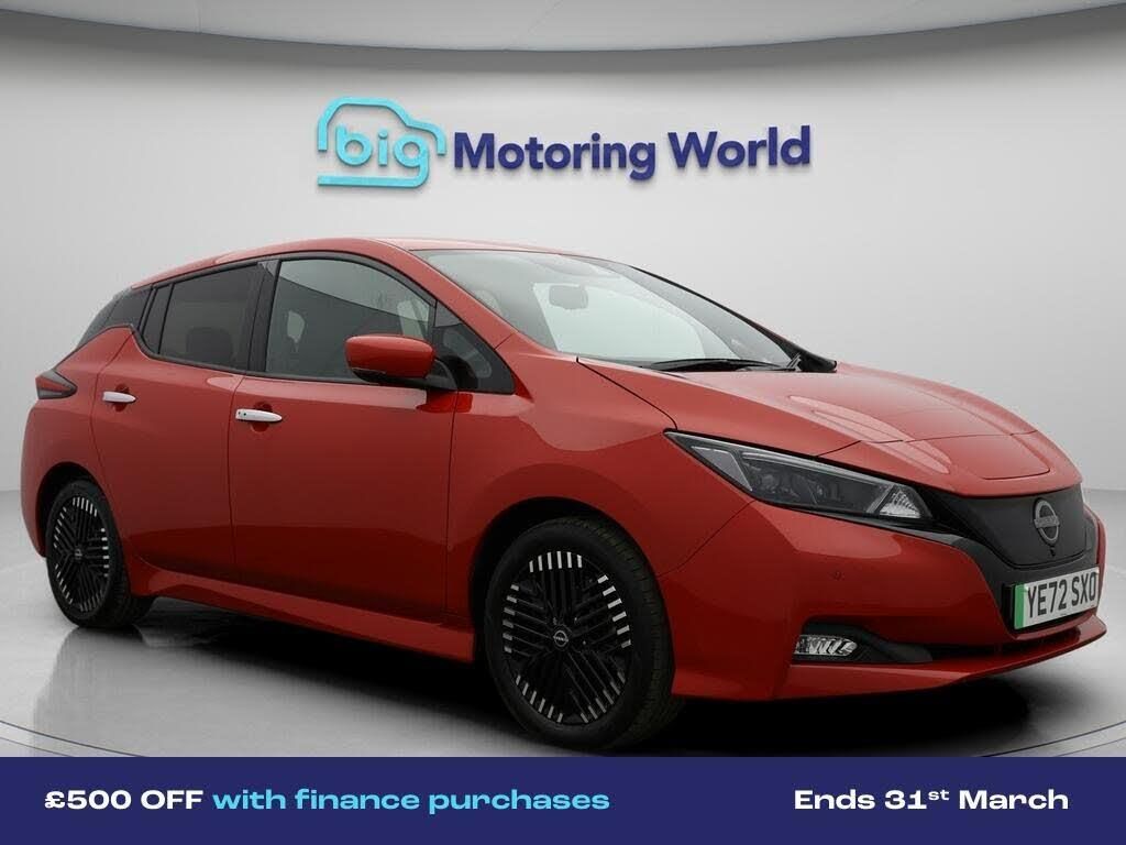 £500 towards your finance depo-Our Nissan Leaf is finished in Red. Specification includes a range of fantastic features including £500 towards your finance deposit, 17'' Alloy Wheels, Part Leather Seats, Leather Seats, Privacy Glass, Heated Seats, Rear View Camera, Heated Rear Seats, Heated Steering Wheel, Bluetooth Specification information is supplied by CAPHPI and may vary to the actual car. This data does not form any part of a buying contact. Please check specification prior to purchase in-store. The MOT is valid until November 2026, visit bigmotoringworld.co.uk for more photos, a 360 tour, service history and a free HPI report.Were BIG on peace of mind and this Red Nissan Leaf has completed our comprehensive 200 point inspection and passed all checks. Its ready for you to drive away with immediate collection in-store. We include a 90-day warranty as standard plus an option to extend for up to 3 years.Reserve this car exclusively for you, safely and securely at bigmotoringworld.co.uk, with a fully refundable £99 deposit. Test drive before you buy, with no commitment, no hassle and a completely haggle free experience. Still searching and want to see thousands more cars? We are BIG on choice with over 8000 cars to choose from.Visit our award winning web site bigmotoringworld.co.uk.Were Big Motoring World and were BIG on what matters to you.