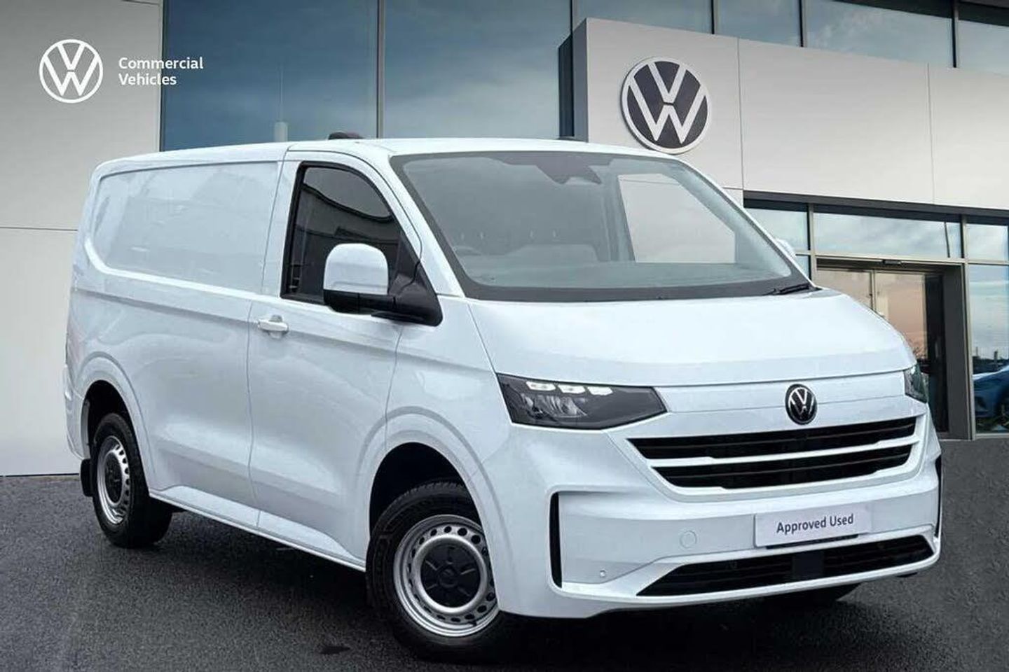 Solid paint-Clear White,Body coloured bumpers,Body coloured mirrors,Body coloured door handles,LED headlights with separate LED daytime running lights,Single sliding side load door,Rear wing cargo doors,Parking sensors front + rear,Rear view camera,High metal partition without window,Rear wing doors,Sliding door on front passenger side,3 seat cab package - Transporter,5 Plus Promise Pack inc. the remainder of:,5 years warranty?,5 Years Roadside Assist?,5 Services?,3 MOTs?,(From date of registration),Solid - Clear White,Striped fabric - Titanium/Palladium black,16" steel wheels with hub caps,Steel spare wheel with jack and without tyre pressure sensor,Heat reflecting side window glass,Mud flaps front and rear,Rear Transporter nameplate in black grained decorative trim,Vehicle opening configuration 1x 1st row of seats,2x all doors,Electronic stability control,ABS,ASR with deactivation button,hill start assist and brake assist system,Cruise control,Electromechanical speed sensitive power steering,height and longitudinally adjustable steering column,Lane assist,Wrong way driver warning,Driver and front passenger airbag with front passenger airbag deactivation,Dual tone horn,Front and curtain airbags for driver and front passenger,Seat belt pretensioner for driver seat,Apple CarPlay and Android Auto,4 speakers - 2x dashboard,2x cab doors,12" digital drivers display,13" touchscreen infotainment display with wireless app connect and DAB radio,5G Modem,Dynamic road sign display,eCall emergency system,Preparation of VW connect and connect plus,Alternator - 230A,2x 15-W USB data/charging ports in dashboard and 1x USB-C,1x USB-A center bottom,3 spoke leather wrapped multi function steering wheel,Black plastic scuff plate for sliding door in cargo without illumination,Leatherette gear lever,Narrow centre console with cup holder and compartment for mobile phone,Overhead storage compartment,Roof grab handle on front passenger side,Rubber floor covering in cab,Striped fabric upholstery,Cabin interior lighting,2x LED lights in load compartment,Lashing rings for reinforced floor covering,Without passenger seats in load compartment,4 way height and tilt adjustable head restraints,Anti theft alarm system with interior monitoring in cab,backup horn and towing protection,Electronic immobiliser,Preparation for alcohol ignition interlock,5+ Promise