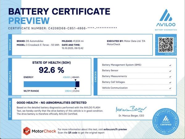 Features: 10in HD Touchscreen,11kW On-Board Charger,12V Socket,18in Alloy Wheels - Kyoto Diamond-Cut,40-60 Split Rear Seats Backrest,7in Digital Instrument Cluster,8 Speakers,ABS - Anti-lock Braking System,Accelerated Charging Cable,Acoustic and Tinted Front and Rear Windscreen,Advanced Safety Pack,Airbags - Front - Rear Lateral and Curtain,Alarm - Perimetric and Volumetric with Anti-Lift Detection,Armrest - Front Centre,Automatic Air Conditioning,Automatic Front Windscreen Wipers,Automatic Rear Wiper when Reverse Gear is Selected,Bag Support Hooks in the Boot,Black Leather Steering Wheel,Bluetooth Handsfree and Media Streaming,Boot Lighting,Chrome Door Handles,Cruise Control with Speed Limiter,DAB Digital Radio,Dark Tinted Rear Windows,Door Mirrors - Electrically Folding and Dimming with DS LED Spotlight,DS Connect Box Emergency and Assistance System,DS Connect Nav System,DS Inspiration - Bastille Leather,DS LED Rear Light,DS Matrix LED Vision Headlights,DS Monogram on the Rear Tailgate,E-TENSE Badging,Electric Parking Brake,ESP - Electronic Stability Programme,Flush Fitting Door Handles,Frameless Electrochromic Interior Rear View Mirror,Front and Rear Carpet Mats,Front and Rear Courtesy Reading Lights - LED,Front and Rear Electric Windows,Front and Rear Grab Handles,Front Chromed Door Entry Sill,Front Double Cup Holder,Front Parking Sensors,Front Seatbelts with Pretensioners and Front-Rear Load Limiter,Gloss Black Door Mirrors,Headlights - Automatic,Heated Rear Windscreen,Height Adjustable Front and Rear Headrests,Height-Adjustable Drivers Seat,Height-Adjustable Front Passenger Seat,Hill Start Assist,LED Daytime Running Lights,Light Grey Interior Roof,Locking Wheel Bolts,Mirror Screen with Android Auto and Apple Car Play,Multi-Function On-Board Trip Computer,Odour Filter,Premium Seat with Comfort Foam and Pads and Map Pocket,Programmable Heater with Temperature Regulator,Proximity Keyless Entry & Start,Rapid Charging Capability - 100kW,Rear Parking Sensors,Remote Central Control Locking with Deadlocks,Reversing Camera,Satin Chromed DS Wings,Seat Belt Unfastened Warning,Sunvisors with LED Courtesy Mirror,Tinted Exterior Door Mirrors,TomTom Speedcam - Danger Zones - 3 Year Subscription,Two Front USB Connection Points,Two Rear ISOFIX Mounting Points,Tyre Pressure Monitor,Tyre Repair Kit,Variable Power Assisted Steering,Voice Recognition,Warning Triangle Fasteners in the Boot,White Centre Caps on Wheels,18in Alloy Wheels - Barcelona Diamond-Cut,18in Alloy Wheels - Lisbon Diamond-Cut,18in Alloy Wheels - Sao Paulo Diamond-Cut,Aluminium Sports Pedals,Artense Grey,Artense Grey with Diamond Red Roof,Artense Grey with Opal White Roof,Artense Grey with Perla Nera Black Roof,Bianca White,Bianca White with Diamond Red Roof,Bianca White with Perla Nera Black Roof,Black Interior Roof,Domestic Charging Cable,DS Inspiration - Opera,DS Inspiration - Rivoli,Grained Leather - Black Basalt,Head-Up Display,Millennium Blue with Opal White Roof,Millennium Blue with Perla Nera Black Roof,Nappa Leather with Watchstrap Design - Art Black Basalt,Nappa Leather-Luxembourg Cloth - Pebble Grey,Pearl Crystal with Diamond Red Roof,Pearl Crystal with Perla Nera Black Roof,Pearl White with Diamond Red Roof,Pearl White with Perla Nera Black Roof,Pebble Grey Nappa Leather Steering Wheel,Perla Nera Black,Perla Nera Black with Diamond Red Roof,Perla Nera Black with White Roof,Platinum Grey,Platinum Grey with Diamond Red Roof,Platinum Grey with Opal White Roof,Platinum Grey with Perla Nera Black Roof,Premium Safety Package,Ruby Red with Diamond Red Roof,Ruby Red with Opal White Roof,Ruby Red with Perla Nera Black Roof,Wireless Charging for Smartphone