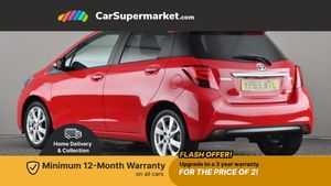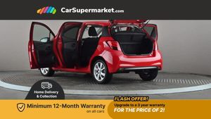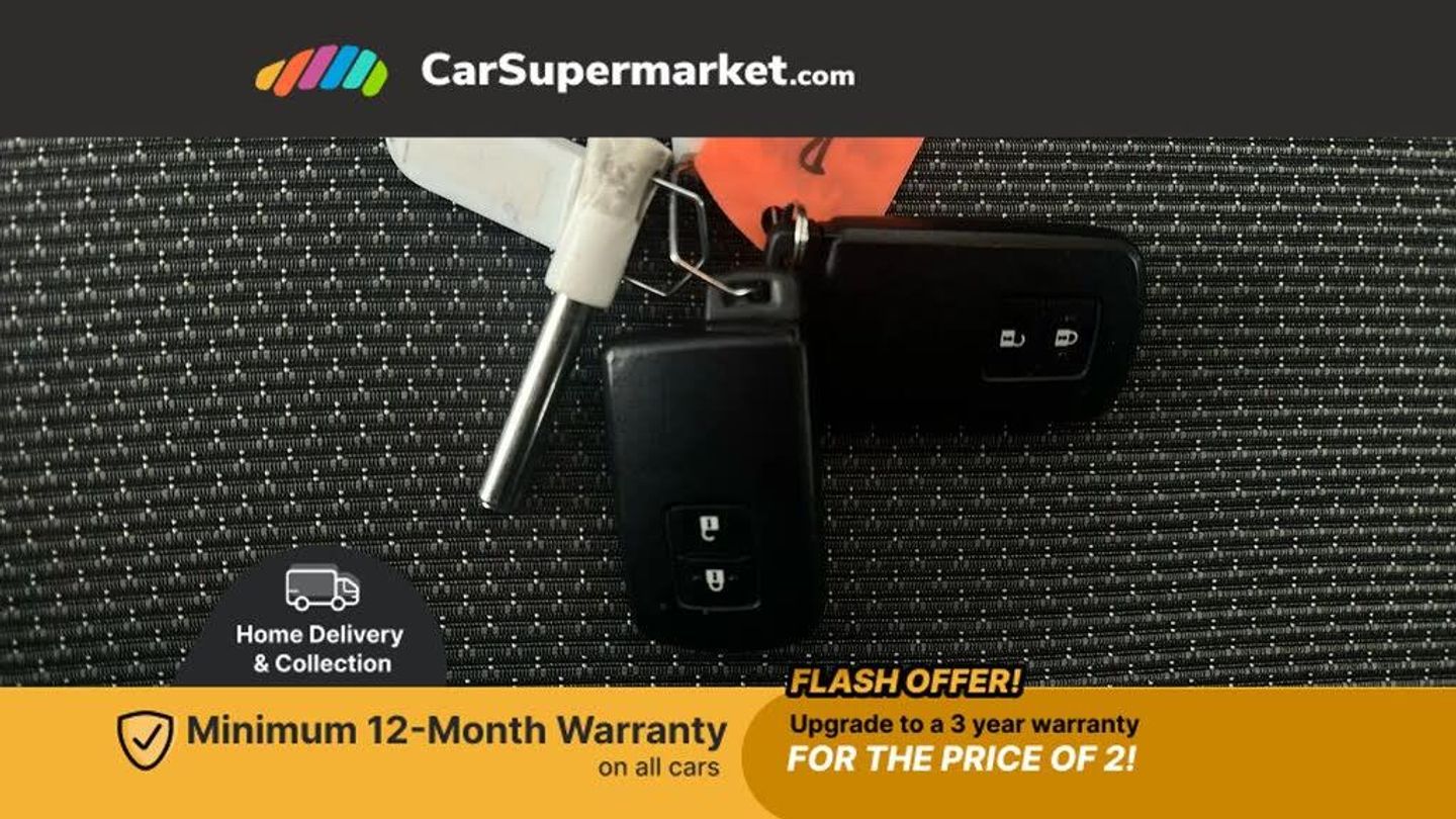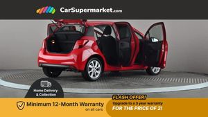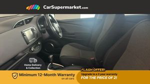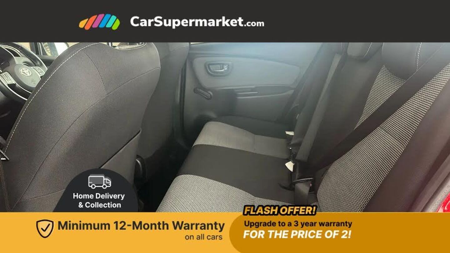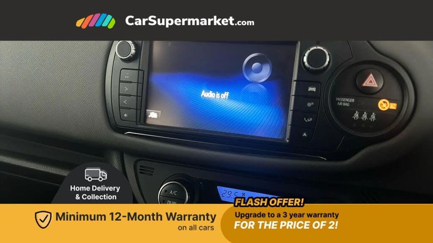 Bluetooth system,Electric boot release,External temperature gauge,Fuel indicator with low level warning,Lights on warning,Push button starter,Rear view camera,Remote fuel flap release,Speed sensitive power steering,Tachometer,Trip computer,6 speakers,Auxiliary input socket,DAB Digital radio,MP3 player,Radio,Steering wheel mounted audio controls,Touch screen audio system,USB connection,2 speed front wipers + intermittent wipe,Body colour heated door mirrors,Chrome rear garnish,Colour keyed bumpers,Colour keyed door handles,Drivers window one touch up/down,Electric front windows,Electrically adjustable door mirrors,Follow me home headlights,Front fog lights,Green tinted glass,Headlamp levelling,Heated rear windscreen,Projector headlamps,Rear wiper,Satin chrome fog light surround,Satin chrome front grille surround,12V Accessory socket,60/40 split folding rear seat,Bekhend cloth upholstery,Boot light,Clean air filter,Driver seat height adjust,Driver's glovebox with lid,Driver/passenger vanity mirrors with covers,Dual zone climate control,Front cupholders x 2,Front map reading lights,Front seats with lumbar support,Height adjustable front head restraints,Height adjustable rear seat head restraints (x3),Interior silver door handles,Isofix system on outer rear seats,Leather gear knob,Leather steering wheel,Rear cupholder,Removable rear parcel shelf,Tilt/telescopic steering column,Design pack - Yaris,3 point seatbelts on all rear seats,ABS+EBD+Brake assist,Collapsible pedal support,Curtain airbags,Door open warning,Driver and passenger airbags,Drivers knee airbag,Front side airbags,Height adjustable front seatbelts with pre-tensioners and load limiters,Hill start assist control (HAC),Passenger airbag deactivate switch,Rear child proof door locks,Seatbelt warning lamp and buzzer,Tyre pressure monitoring system,Vehicle stability control VSC + traction control,Ventilated front disc brakes,Engine immobiliser,Remote central locking,Instrument panel in Dark grey,16" 8 spoke silver alloy wheels,Tyre repair kit
