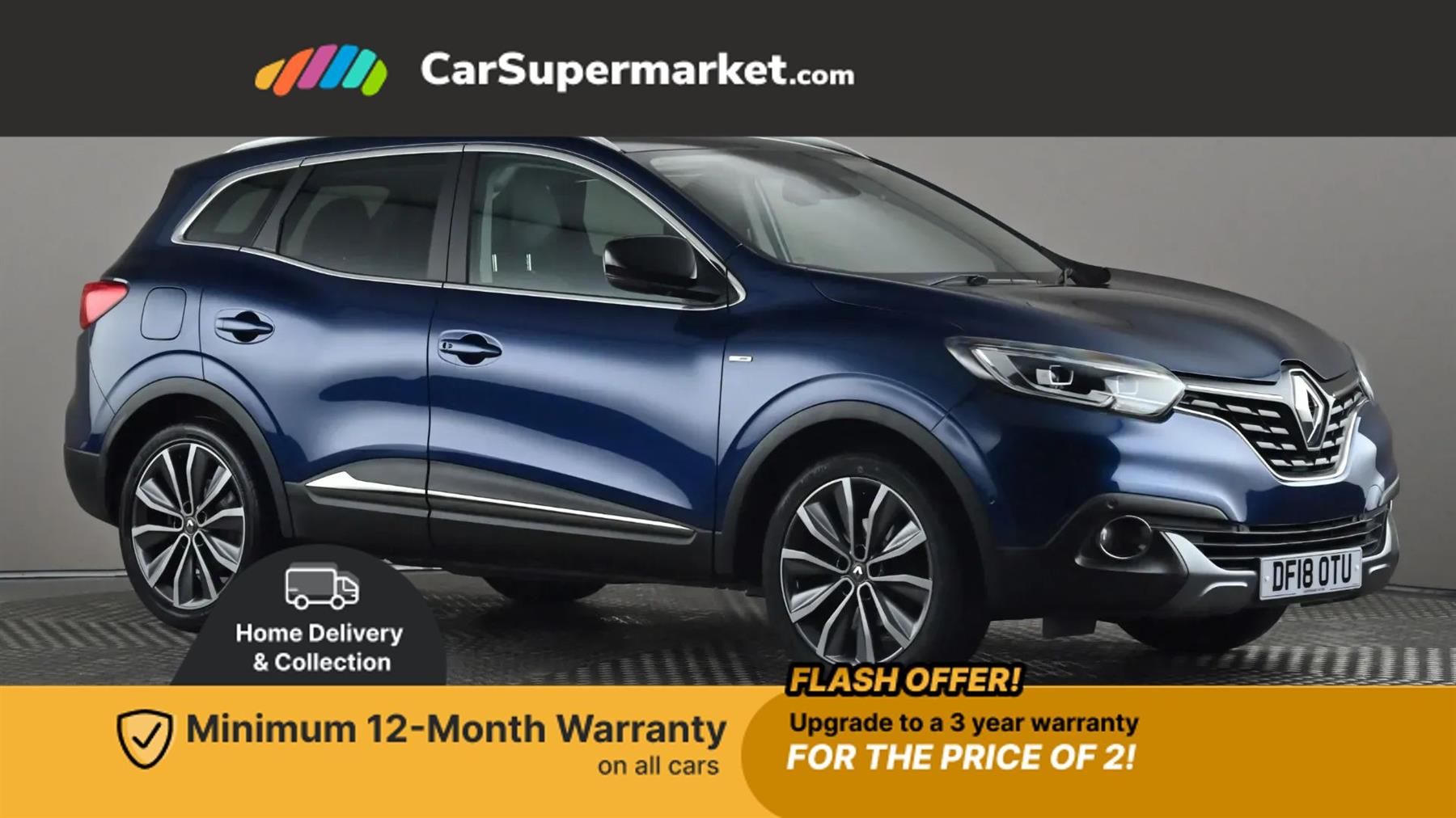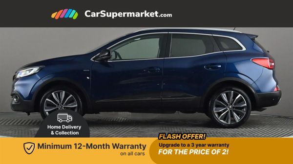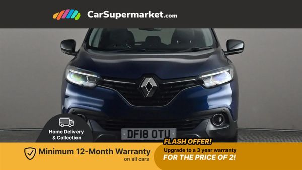Bluetooth system,Cruise control + speed limiter,Door/boot open warning light,Eco mode,Exterior temperature gauge,Front and rear parking sensors,Low fuel level warning light,Oil level gauge,PAS,R-Link Multimedia system with 7" touch screen, satellite navigation and western European map,Rev counter,Traffic sign recognition,Trip computer,Visio system - lane departure and high beam assist,Bose Premium Audio system with 7 premium speakers + subwoofer,DAB Digital radio,Fingertip controls for audio system,USB connection,Automatic headlights and windscreen wipers,Body colour door handles,Body coloured bumpers,Body coloured door mirrors,Bodyside mouldings with chrome inserts,Chrome exterior trim,Chrome window surround,Cornering front fog lights,Electric adjustable/heated/folding door mirrors,Electrochrome rear view mirror,Extra tinted glass in rear windows and tailgate,Fixed panoramic glass sunroof,Front and rear electric windows,Front and rear towing rings,Front skid plate,Front wipers with variable intermittent facility,Heated rear windscreen,Integrated fuel filler cap,LED daytime running lights,LED Headlights,Rear skid plate,Rear wiper,Roof rails,12v power outlet - front,3 height adjustable rear headrests,3 seat rear bench,60/40 split folding rear seat,Adjustable dashboard illumination,Air recirculation system,Centre rear armrest with cup holder,Driver's seat with lumbar adjustment,Driver/passenger reading lights,Dual zone automatic climate control,Front centre armrest,Front courtesy lights,Front footwell illumination,Glovebox with light,Height adjustable front headrests,Height/reach adjust steering wheel,Illuminated boot,Illuminated sun visor mirrors,Isofix system on outer rear seats,Nappa leather steering wheel,One touch easy folding rear seating system,Pollen filter,Rear courtesy lights,Rear passenger heating ducts,Variable boot floor,Leather pack with electric driver seat - Kadjar,Parking pack premium - Kadjar,ABS/EBD,Brake assist function,Driver/passenger 2 stage auto adaptive airbags,Electronic parking brake,ESP with ASR and UCL (understeer control logical),Front and rear curtain airbags,Front lateral airbags,Front seat belts warning,Height adjustable front seatbelts + pretensioners,Hill start assist,Passenger airbag deactivation system,Rear seatbelt warning indicator,Three 3 point rear seatbelts,Traction control,Tyre pressure monitor,Anti-drill door locks/ignition barrel,Deadlocks,Hands free Renault card,Insurance approved Cat 1 alarm system,Insurance Approved Immobiliser,RAID (Renault Anti-Intruder Device) with automatic door locking,Remote central locking,19'' Zeus diamond cut alloy wheels,Tyre inflation kit,Cosmos Blue