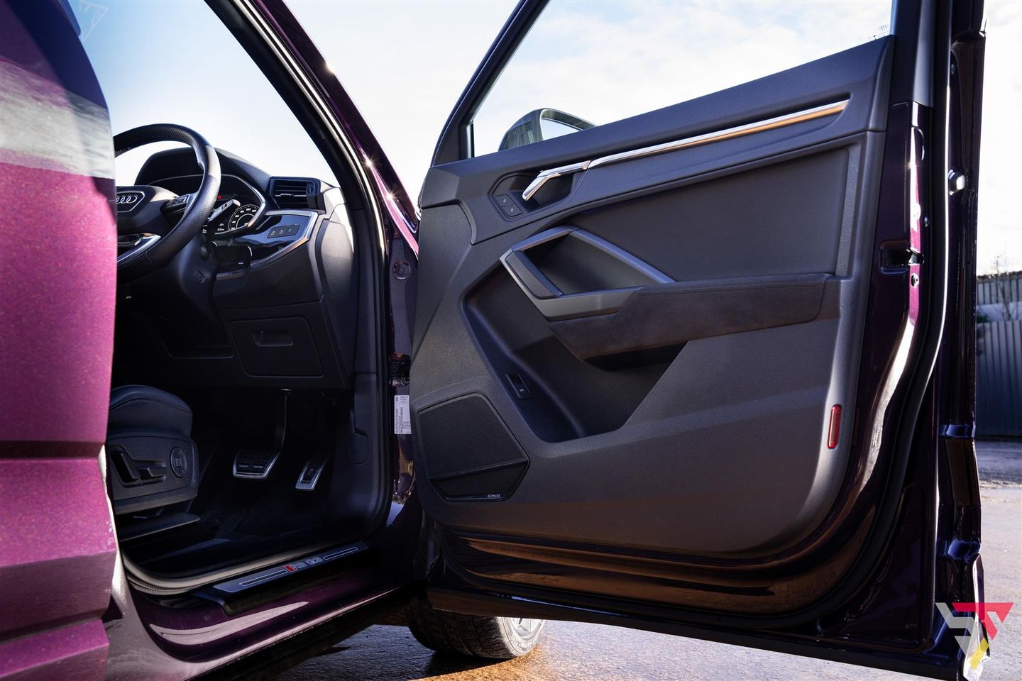 Merlin Purple is one of Audi Exclusive’s most captivating paints, deep and expressive with a pearlescent glow that shifts beautifully in changing light. Red RS calipers, carbon-fibre mirror caps and the gloss-black exterior styling package enhance the already purposeful stance of the RSQ3.