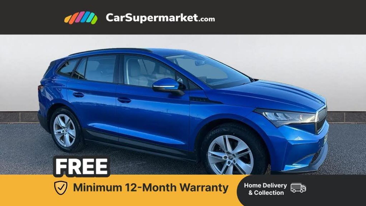 13" touchscreen display,Bluetooth system,E-call,Electronic engine sound,Exterior temperature indicator,Gesture control,Power assist steering,Rear parking sensors,Satellite navigation system,Skoda Connect iV remote services with charging, air conditioning and smart schedules,Smartlink wireless for apple carplay and wired for android auto,Speed limiter,Tailgate unlocking from outside,Virtual cockpit,Voice control system,Washer fluid level indicator,Wi-Fi hotspot,120 kW DC charging,6m mode 3 cable (32A),8 Speakers,DAB Digital radio,USB-C ports (charging + data),Auto dimming rear view mirror,Black roof rails,Body colour bumpers,Body colour door mirrors and handles,Door moulding light in multiple colours,Electric adjustable heated folding door mirrors with boarding spots and welcome logo,Electric front and rear windows,Heat insulating darkened glass in side and rear windows,Heat insulating glass in windshield,Heated rear window,LED third brake light,Light assistant (coming home/tunnel light),Radiator grille frame in matt black with chrome strip,Rain and light sensors,Rear side wing doors,Rear spoiler,Rear window wiper with washer system and intermittent control,Safety reflectors on front and rear doors,Variable front intermittent wipers,12V socket in boot,3 rear headrests,3 seat bench in 2nd row,4 foldable roof handles with rear coat hooks,60:40 foldable rear seat with sliding adjustment and backrest angle adjustment,Boot lighting,Coat hooks on B pillar,Front and rear footwell lighting,Front and rear height adjustable headrests,Front courtesy lights,Front reading lights,Height adjustable front passenger seat,High centre console,Illuminated and cooled glovebox,Interior door handle lighting in front and rear,Isofix child seat fittings in outer rear seats with top tether,Isofix child seat preparation for front passenger seat,Laminated soft-touch plastic knee rest,LED ambient lighting,Manual lumbar support for front passenger seat,Manually adjustable steering column,Pollen filter,Rear reading lights,Single front passenger seat,Sliding boot cover,Sunvisors with illuminated vanity mirrors,Umbrella in door panel,ECO Suite design pack - Enyaq,3 point height adj front seatbelts + pretensioners,Auto door release and activation of warning lights in the event of an accident,Central interaction airbag,Driver and front passenger airbags,ESC (incl. ABS+MSR+ASR+EDS+HBA+DSR+RBS+MKB),Front and rear three point safety belt on all seats,Front assist with assisted automatic braking,Front disc brakes,Front passenger airbag deactivation switch,Front side airbags with curtain airbags,Rear drum brakes,Single tone horn,Tyre pressure monitor,Visual and acoustic seat belt reminder,Warning lights in front doors,Anti theft alarm system with interior monitoring, backup horn and towing protection,Remote central locking with SAFE system,Anti-theft wheel bolts protection,Tyre repair kit with compressor