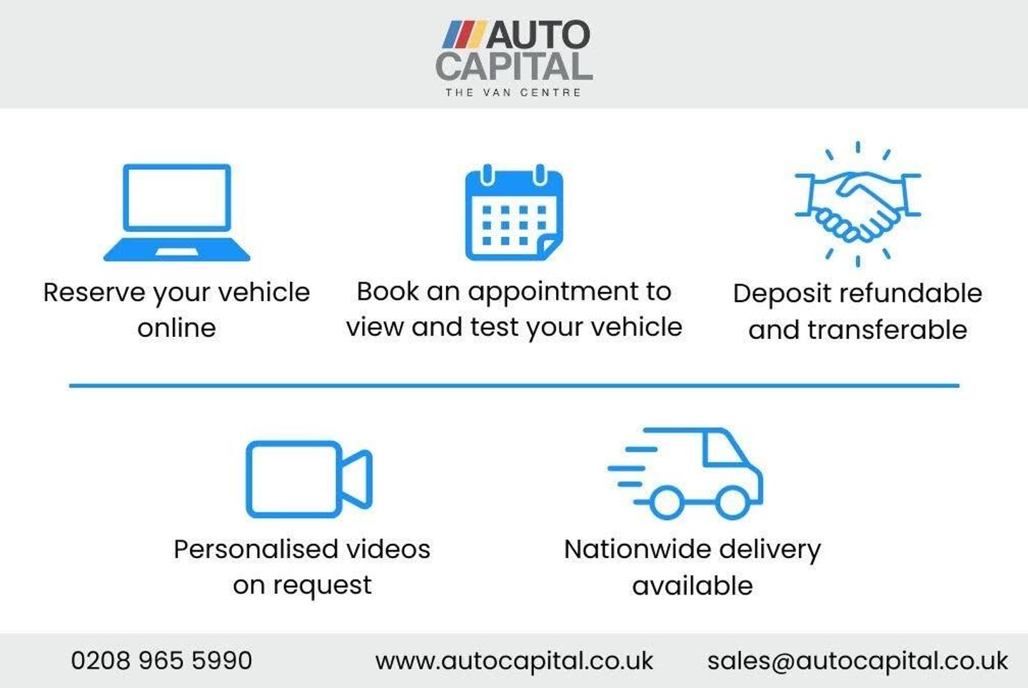 Immediate Delivery, Maxus, Deliver 9, 2.0, D20, Base, FWD, 163 BHP, L3 H2, Panel Van, Euro 6, ULEZ Compliant and ready to work in all major city zones, LM71SYJ, First Registered 22/12/2021, MOT until 01/07/2026, Well-maintained and ready for its next job. Air conditioning, Rear parking sensors for damage prevention and easy manoeuvring, Driving Model (Power/ Normal/ Eco), Auto Start/Stop system, Multifunction leather steering wheel, Cruise control, Electric Power Steering, Bluetooth, Audio with Radio, MP3, AUX-USB, Electric windows and mirrors, Central Lock, 8-direction Adjustable Driver's Seat with armrest, Front Passenger Airbags, Intelligent Anti-theft Security System, Lane departure warning system, Signature front chrome grill, Halogen Headlight, LED Daytime Running Lights. Ready for the road, Reserve today. We offer nationwide delivery, and competitive finance packages. Call Auto Capital Ltd today on [0208 9655990] to arrange an immediate viewing, or Reserve this vehicle online. Auto Capital LTD, more than just a van dealership – we’re your ultimate destination for all your commercial vehicle needs. From RAC warranties and Rhino Roof Racks to L4V Security Locks and MR4 Shelving solutions, we offer a comprehensive range of accessories to help you maximize your van’s potential. Partnering with the UK’s leading brands, we provide in-house fitting for Tracker systems, Road Angel Dash Cameras, Reverse Cameras, Legend Lining, Ply Lining, Rhino Roof Racks, Rhino MR4 Racking, Oz Alloys, Michelin Tyres, Sign Writing, and as a Skywell Franchise Dealer, we supply brand-new electric vehicles with Hyper Volt chargers. All our commercial vehicles are RAC-approved and Euro 6. As a SAF-accredited and FCA-authorized credit broker, we offer tailored in-house finance solutions through a panel of trusted lenders. With a reputation built on 5-star reviews from Google, AutoTrader, and Trustpilot, Auto Capital is your trusted partner for high-quality commercial vehicles.