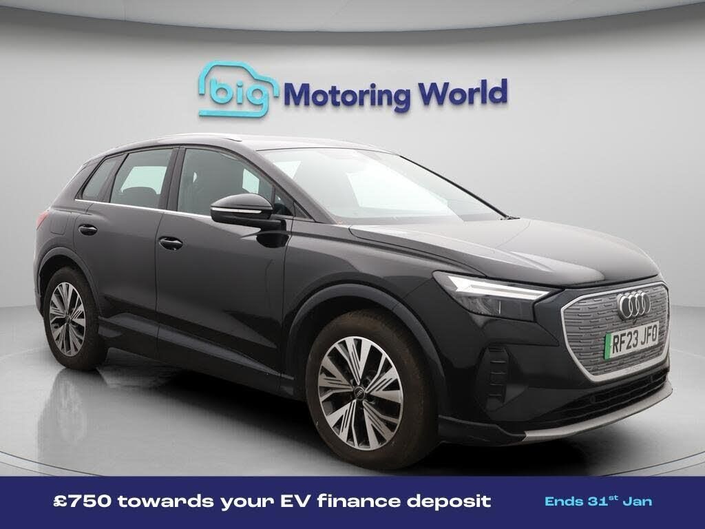 £750 towards your finance depo-Our Audi Q4 e-tron is finished in Black. Specification includes a range of fantastic features including £750 towards your finance deposit, 19'' Alloy wheels, Apple CarPlay, Lane Assist, Android Auto, Satellite Navigation, Heated Seats, Bluetooth, Parking Sensors, Audi Connect Specification information is supplied by CAPHPI and may vary to the actual car. This data does not form any part of a buying contact. Please check specification prior to purchase in-store. The MOT is valid until June 2026, visit bigmotoringworld.co.uk for more photos, a 360 tour, service history and a free HPI report.Were BIG on peace of mind and this Black Audi Q4 e-tron has completed our comprehensive 200 point inspection and passed all checks. Its ready for you to drive away with immediate collection in-store. We include a 90-day warranty as standard plus an option to extend for up to 3 years.Reserve this car exclusively for you, safely and securely at bigmotoringworld.co.uk, with a fully refundable £99 deposit. Test drive before you buy, with no commitment, no hassle and a completely haggle free experience. Still searching and want to see thousands more cars? We are BIG on choice with over 8000 cars to choose from.Visit our award winning web site bigmotoringworld.co.uk.Were Big Motoring World and were BIG on what matters to you.