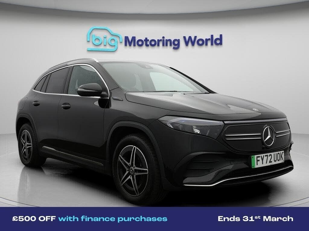 £500 towards your finance depo-Our Mercedes-Benz EQA is finished in Black. Specification includes a range of fantastic features including £500 towards your finance deposit, Comfort Pack, All Wheel Drive, 18'' alloy wheels, Part Leather Seats, Air Suspension, AMG body styling, Parking Pack, Satellite Navigation, Privacy Glass Specification information is supplied by CAPHPI and may vary to the actual car. This data does not form any part of a buying contact. Please check specification prior to purchase in-store. The MOT is valid until October 2026, visit bigmotoringworld.co.uk for more photos, a 360 tour, service history and a free HPI report.Were BIG on peace of mind and this Black Mercedes-Benz EQA has completed our comprehensive 200 point inspection and passed all checks. Its ready for you to drive away with immediate collection in-store. We include a 90-day warranty as standard plus an option to extend for up to 3 years.Reserve this car exclusively for you, safely and securely at bigmotoringworld.co.uk, with a fully refundable £99 deposit. Test drive before you buy, with no commitment, no hassle and a completely haggle free experience. Still searching and want to see thousands more cars? We are BIG on choice with over 8000 cars to choose from.Visit our award winning web site bigmotoringworld.co.uk.Were Big Motoring World and were BIG on what matters to you.
