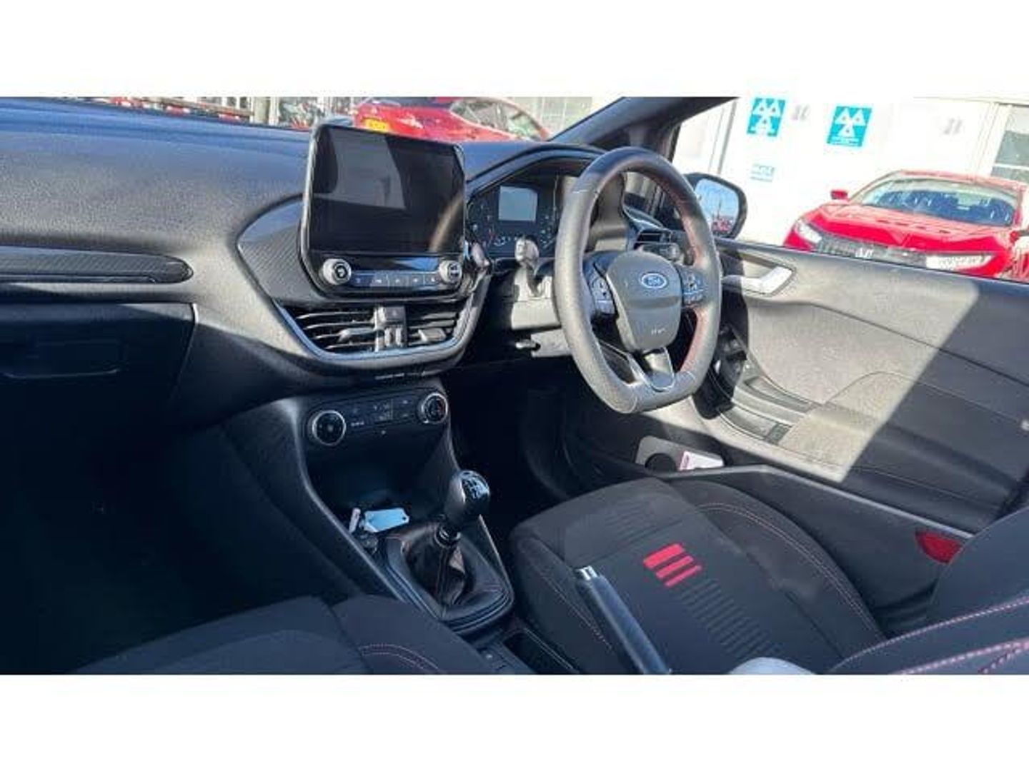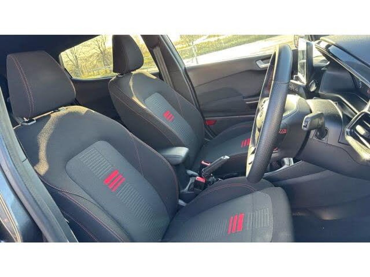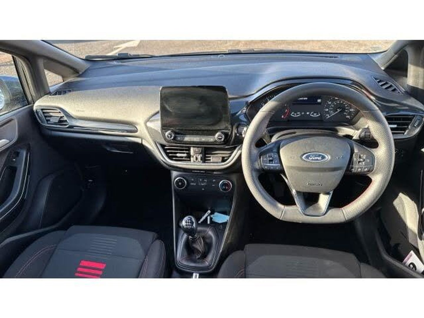 Boot carpet, Electric rear windows, ABS+EBA, Sports suspension, Bluetooth system, Electric power steering, Ford easy fuel, Trip computer, Body coloured electrically operated and heated door mirrors with side indicators, Steering wheel mounted controls, Body colour door handles, Cornering front fog lights, Manual air conditioning, Cloth upholstery, Footwell illumination, NCAP Pack - Fiesta, Driver and passenger airbags, Front seat and rear pockets, Thatcham Cat.1 alarm, 17" 5 spoke alloy wheels with rock metallic finish