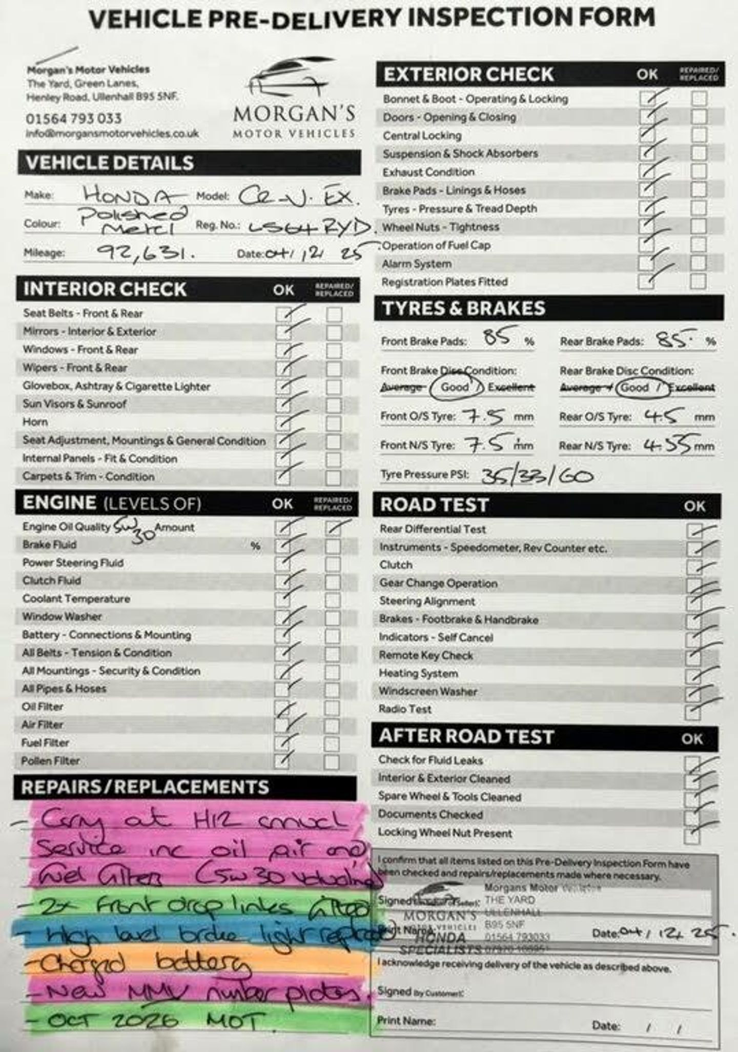 Thank you for checking us out and reading our reviews!, At Morgans Motor Vehicles, we do things differently:, Relaxed, friendly atmosphere no pushy sales targets. Expert Honda knowledge every car prepared to the highest standard. Premium experience enjoy a proper Nespresso coffee while we help you find the right car. Were proud to offer:, No time limits on appointments, Transparent service history, AA Dealer Promise(where applicable):, Annual service, Full inspection report, New MOT (if less than 7 months ), 12 months AA roadside assistance, Your next Honda deserves care and attention and so do you. Call or email us today for a stress-free experience. THE CAR: This well presented Honda CR-V has just 92,630 miles and ONLY TWO owners from new. She has been extremely well maintained and offers excellent value for money. Our MMV service consists of a pre MOT checking all lights and levels, as well as adding fully synthetic Valvoline 5W30 Motor oil, a new oil filter air filter and pollen filter (pollen if applicable) to this lovely vehicle. Our uploaded photo Inspection form confirms :, Tyres are of good quality across both axles. Brake pads are in good condition with the brake discs in healthy condition. To complete our handover we will help the new owner by going through all relevant documents such as the V5 Registration certificate transfer and taxation, and discuss our 6 month MMV warranty for your convenience. PLEASE CALL MORGAN YOUR FRIENDLY HONDA EXPERT