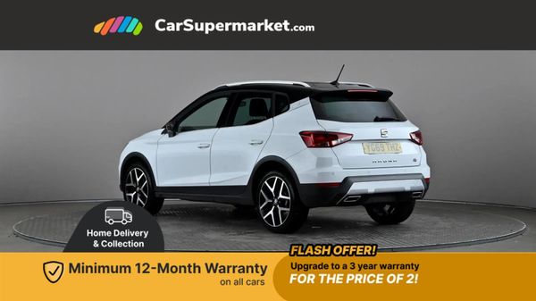 'Lights On' Reminder warning buzzer,Cruise control,Digital clock,Digital cockpit,Electric speed sensitive power steering,Full Link Smartphone Integration with Mirror Link, Apple Car Play, Google Android Auto with USB Type C cable for Apple and Android compatibility,Low fuel warning light,Outside temperature display,Rear parking sensor,RPM counter,SEAT Drive profile - Four different models normal-sport-eco-individual, steering response, throttle response,Trip computer,Sports suspension,6 speakers,Bluetooth interface for hands free and audio streaming,DAB digital radio and AM/FM radio,Steering wheel mounted audio controls,Anti theft roof antenna,Auto dimming interior rear view mirror,Automatic activation of hazard warning lights,Automatic headlights,Body coloured bumpers,Body coloured door handle inserts,Chrome front grille frame,Chrome roof rails,Chrome window trim,Coming/leaving home lighting function,Dark tinted rear windows,Electric front/rear windows with one touch/auto up/down,Electrically adjustable, heated and folding door mirrors,Full LED headlights dipped and mainbeam + front and rear fog lights,Ice metal door side panels,LED daytime running lights,LED rear tail lights and licence plate lights,Rain sensing wipers,Rear window wash/wipe,Roof colour door mirrors,Twin exhaust pipe styling hidden exhaust pipe,Visible VIN plate,Windshield wiper with intermittent control and potentiometer,2 cupholders,60/40 split folding rear seat,Black interior roof,Double boot floor,Driver sunvisor with covered mirror + card holder,Dual zone climate control,Dust/pollen filter,Front courtesy light with front reading lights,Front sport seats,Gear shift indicator,Height adjustable front seats,Height/reach adjustable steering column,Illuminated boot,Instrument lighting with brightness control,Interior footwell lighting,ISOFIX points in outer rear seats with top tether anchorage points,Microsuede cloth upholstery,Multi-colour ambient interior lighting,Passenger sunvisor with vanity mirror,Perforated flat bottomed leather steering wheel/gear knob/handbrake with red stitching and FR logo,Two front and three rear height adjustable headrests,Connectivity pack plus - Arona,Interior chrome pack - Arona,Winter pack - Arona,3 point seatbelts on all rear seats,ABS,Active front headrests,Child locks on rear doors,Driver and front passenger airbags with front passenger airbag de activation, front side and curtain airbags,Electronic stability control,Emergency Brake Assist (EBA) and front assist,Front and rear seatbelt reminder,Hill hold control,Multi-Collision braking,Tiredness recognition system,Traction control,Tyre pressure monitoring system,Alarm with back-up horn,Electronic engine immobiliser,Locking wheel bolts,Remote central locking + deadlocks,Tow away protection,Interior chrome line trim,Leatherette dashboard,18" Performance alloy wheels