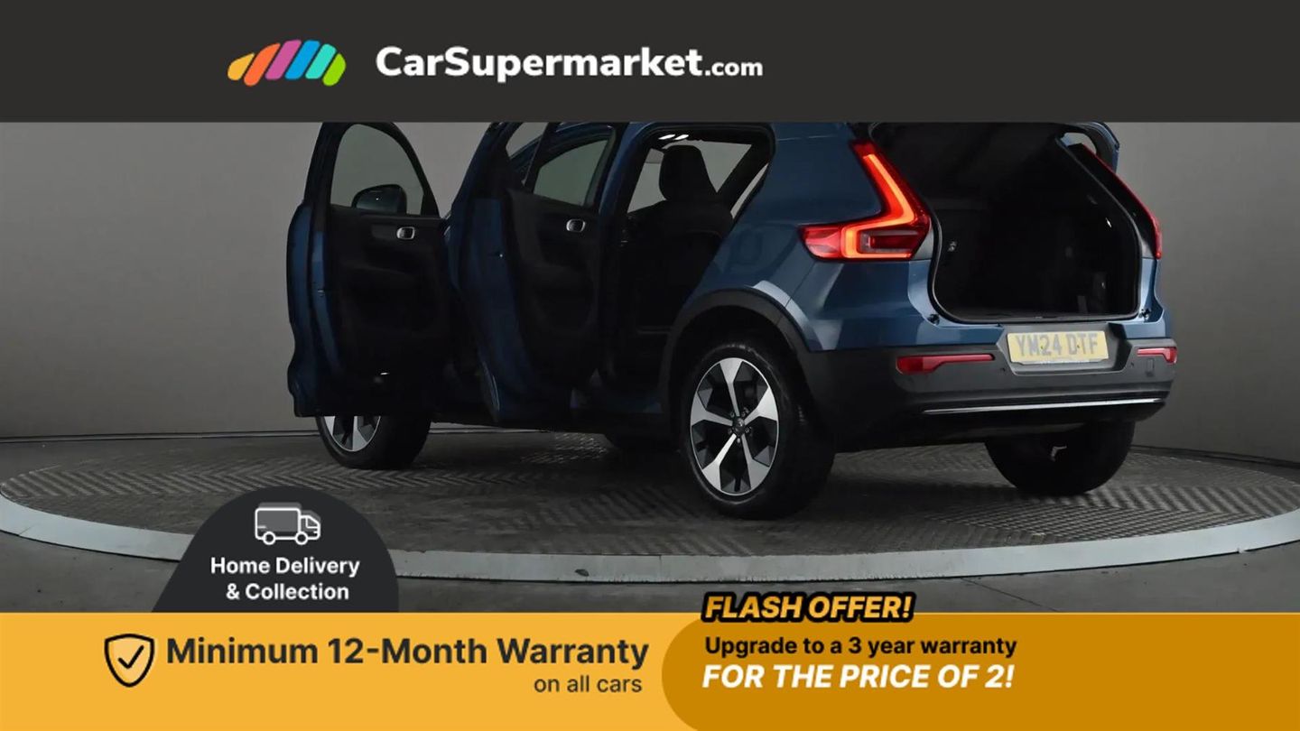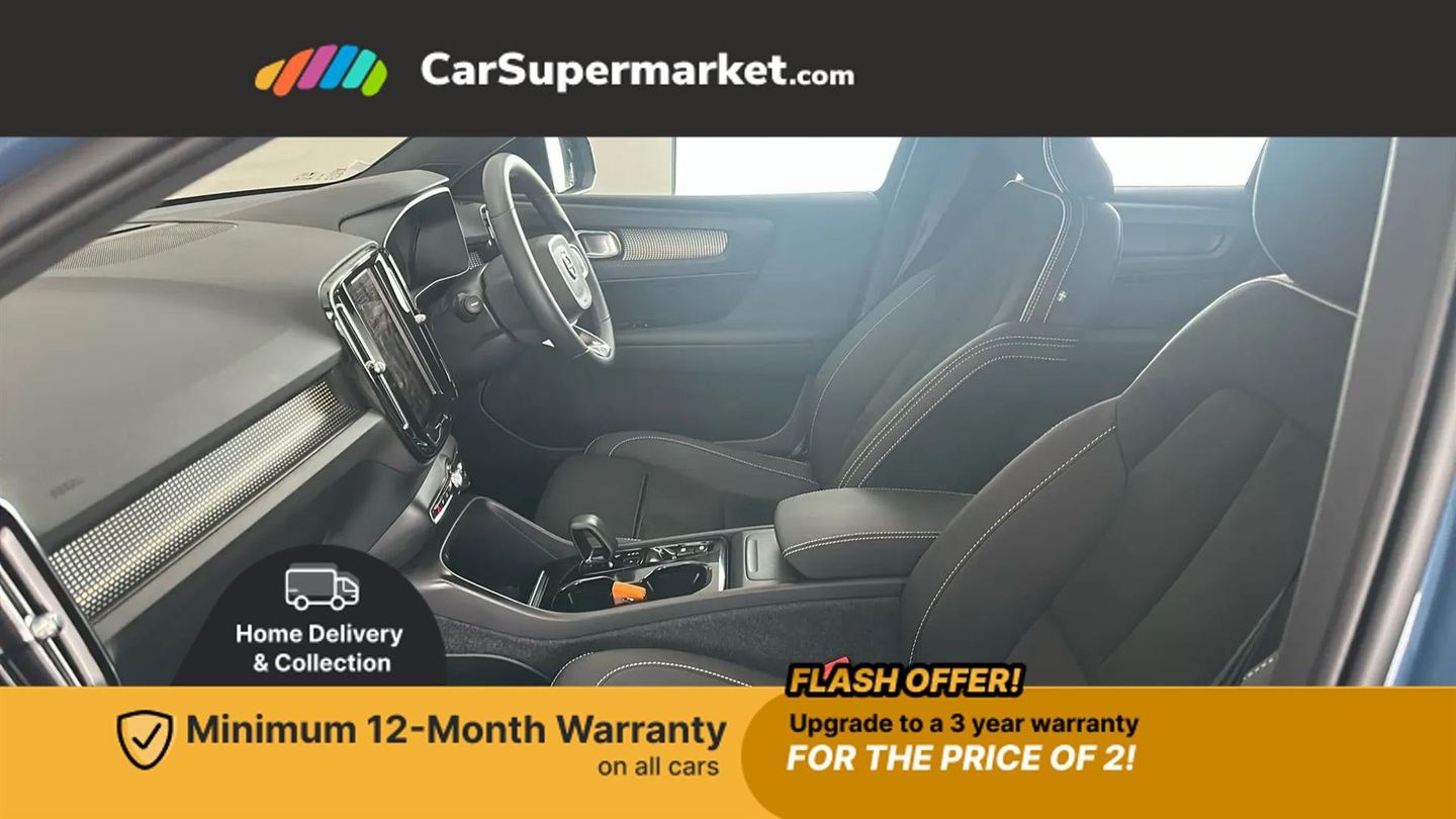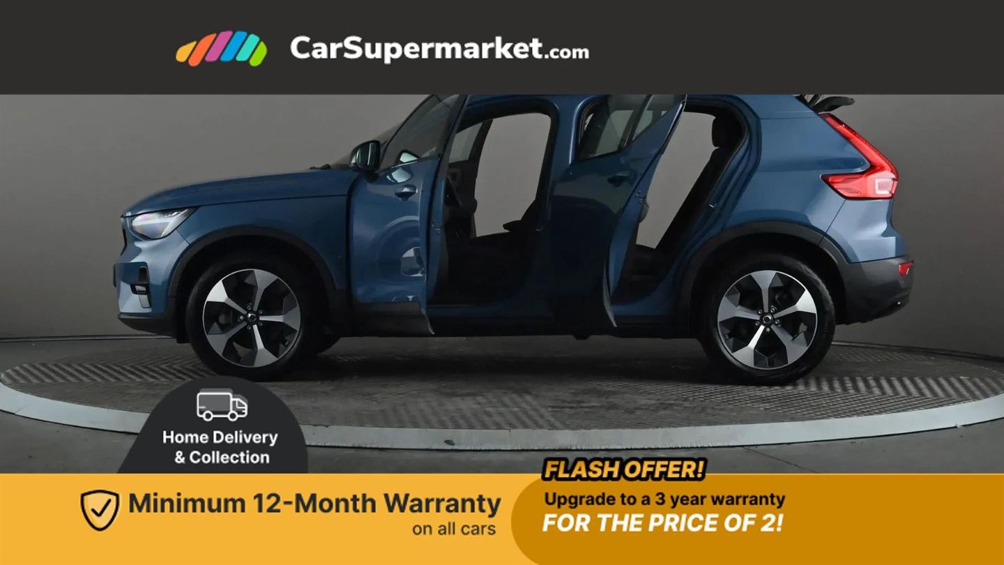 12.3" Progressive Driver Display,9" centre console portrait touch screen,Adjustable steering wheel force,Apple carplay (wired),Bluetooth handsfree system,Cruise control,Driver alert control,Driver awareness - Blind spot information system with steer assist, cross traffic alert with autobrake and rear collision warning and mitigation,E-call,Front park assist,Google automotive services - Enabled entertainment apps, navigation with google maps, voice recognition with google assistant,Hands free power tailgate,Intelligent speed assistance,Lane keeping aid,Oncoming Lane Mitigation,Rear park assist,Rear park assist camera,Speed sensitive steering,Volvo cars services with app - Driving journal, emergency and breakdown call, engine remote start, remote door locking/unlocking and vehicle dashboard,Wireless/Inductive Mobile Phone Charging,Automatic transmission with start/stop and manual change functions,Dynamic chassis,DAB Digital radio,High performance sound, 8 speakers/250W, 2 front type C and 2 rear type C USB,Steering wheel mounted remote controls,Adaptive brake lights with high level LED brake lights,Auto dimming feature for exterior door mirrors,Auto dimming interior mirror,Automatic headlamp levelling,Automatic LED Headlights + Active high beam incorporating daytime running lights,Front aluminium tread plates,Front and rear electric windows,High gloss black front and rear skid plate,High gloss black front bumper deco,High gloss black mesh front grille with high gloss black surround,High gloss black window trim,Home safe and approach lighting,Integrated roof rails in high gloss black,LED front fog lights,Puddle lights,Rain sensor with automatic windscreen wiper activation,Rear side wing doors,Rear wiper,Roof antenna,Roof spoiler,Visible VIN plate,12V socket in front tunnel console and luggage compartment,2-Zone electronic climate control with CleanZone air quality system and pollen filter,3 seat bench in 2nd row,3 Spoke tailored steering wheel with chrome trim,60/40 versatile split folding rear seat,A-pillar parking ticket holder,Centre console cupholders and storage,Charcoal headlining,Connect textile/microtech upholstery,Flexible load floor and grocery bag holder,Front cabin courtesy lights,Front door pocket, front cupholder, ambient front door, rear reading, rear courtesy, instrument panel and tailgate lighting,Front footwell illumination,Front headrests,Front reading lights,Front seat cushion extensions,Front side step illumination (under door),Glovebox bag hook,Heated front seats,Height adjustable passenger seat,Height/reach adjustable steering column,High gloss centre tunnel deco,Illuminated glovebox,Illuminated luggage compartment,Illuminated vanity mirrors + ticket holder,Integrated waste bin,Isofix attachments on outer rear seats,Load cover,Load protection net,Multi directional lumbar support for driver and passenger seat,Power driver seat with memory + exterior mirrors memory,Rear armrest with cupholders,Rear headrests,Single front passenger seat,Underfloor cargo storage,Climate pack without heated front seats - XC40,3x3 point rear seatbelts,City safety with steering support with Pedestrian + cyclist + front collision warning with full auto brake and rear auto brake,Driver and passenger airbags,Drivers knee airbag,Electronic parking brake with auto hold,First aid kit,Front and outer rear seatbelt reminder and pretensioners,Front seats SIPS airbags,Hill descent control,Hill start assist,Inflatable curtain,Passenger airbag cut-off device,Power child locks on rear doors,Road sign information display,Run off Road Protection,SIPS (Side Impact Protection System),Slippery road and hazard light alert,Stability and Traction Control with Spin control, Engine Drag Control and Corner Traction Control,Tyre pressure monitoring system,Vehicle deceleration control with Anti-lock Brake System, Electronic Brake Distribution and Emergency Brake Assist,Warning triangle,WHIPS whiplash protection system - front,2 x Key integrated remote control central locking including with deadlocking system and auto open/close windows,Anti-theft alarm including immobiliser/volume sensor + level sensor,Keyless drive includes keyless entry and keyless start,Locking wheel nuts,Connect Textile-Microtech - Charcoal,Fjord Blue,19in Alloy Wheels - 5 Y Spoke - Diamond Cut - Matt Graphite