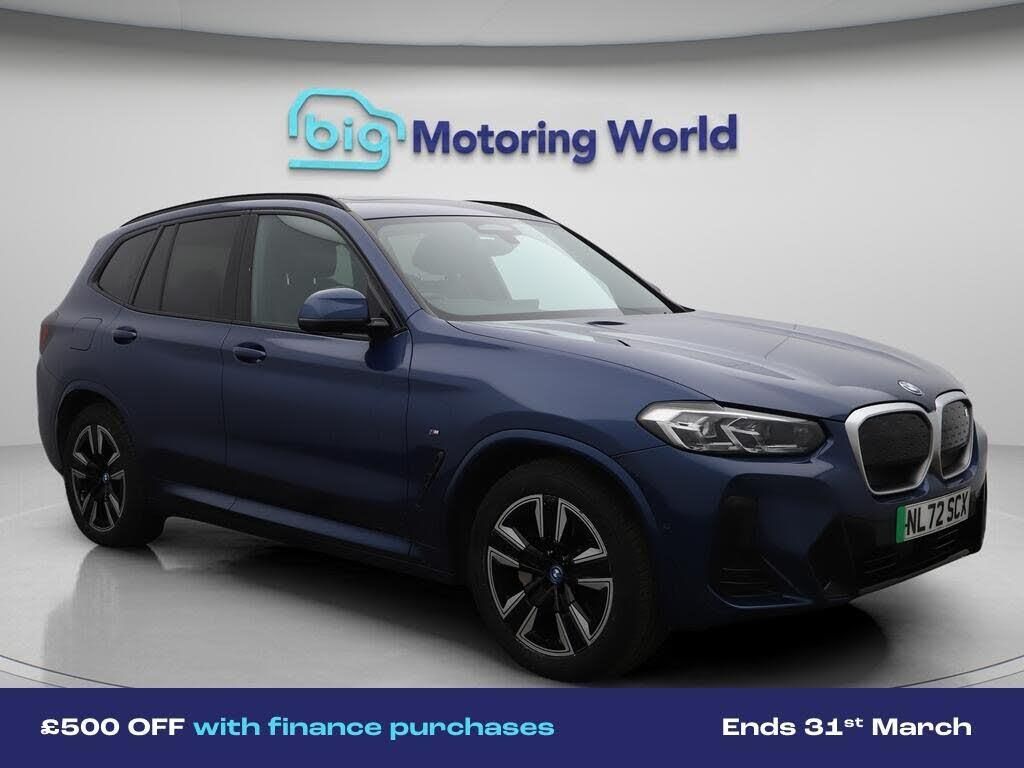 £500 towards your finance depo-Our BMW iX3 is finished in Blue. Specification includes a range of fantastic features including £500 towards your finance deposit, Panoramic Roof, Sun Protection Pack, 19'' Alloy wheels, Leather Seats, Apple CarPlay, Adaptive Cruise Control, Electric Seats, Harman Kardon Speakers, Electric Panoramic Roof Specification information is supplied by CAPHPI and may vary to the actual car. This data does not form any part of a buying contact. Please check specification prior to purchase in-store. The MOT is valid until November 2026, visit bigmotoringworld.co.uk for more photos, a 360 tour, service history and a free HPI report.Were BIG on peace of mind and this Blue BMW iX3 has completed our comprehensive 200 point inspection and passed all checks. Its ready for you to drive away with immediate collection in-store. We include a 90-day warranty as standard plus an option to extend for up to 3 years.Reserve this car exclusively for you, safely and securely at bigmotoringworld.co.uk, with a fully refundable £99 deposit. Test drive before you buy, with no commitment, no hassle and a completely haggle free experience. Still searching and want to see thousands more cars? We are BIG on choice with over 8000 cars to choose from.Visit our award winning web site bigmotoringworld.co.uk.Were Big Motoring World and were BIG on what matters to you.