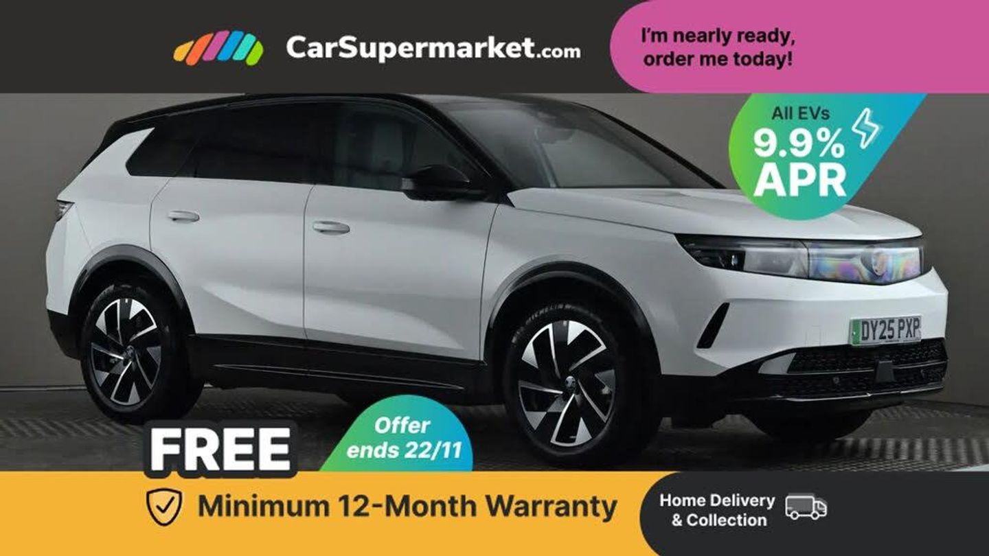 10" digital instrument cluster,16" multimedia navigation with wireless Apple Carplay/Android auto,Adaptive cruise control with Stop and Go,Central facia display with digital clock, outside air temperature and audio information,Digital fuel gauge with low fuel level warning light,Digital speedometer,Drive mode selector (Eco, Normal, Sport),Driver drowsiness alert system,Electric power steering,Extended traffic sign recognition,Front and rear parking sensors,In-crash braking,Intelligent speed adaptation,Lane keep assist,Lights on audible warning,Manual tailgate,Multi function trip computer - Trip odometer, vehicle range, average speed and fuel economy, instantaneous fuel economy and driving time,Rear view camera,Speed sign recognition,Vauxhall connect including Emergency call (SOS e-call) and Breakdown call (b-call),Wireless charger for mobile devices,11 kW Onboard charger,Anti-roll bars,Compound crank rear suspension with coil springs and gas pressure dampers,Frequency selective damping (FSD) suspension,Independent decoupled MacPherson strut front suspension with gas pressure dampers and coil springs, anti-roll bar,Stability control,2 rear USB-C sockets,6 speakers,AM/FM and DAB radio,Radio controls on steering wheel,Acoustic windscreen,Auto headlights,Automatic headlight beam levelling,Black door mirrors,Body colour door handles,Dark tinted rear windows,Electrically defrosting driver and passenger door mirrors,Electrochromic rear view mirror,Front illuminated griffin,Front wiper system spraying directly from wipers,Glossy black lower door claddings,High gloss black front and rear bumpers,High gloss black roof spoiler,High gloss black wheel arch claddings,Illuminated rear Vauxhall,IntelliLux LED headlights with 3D illuminated vizor, welcome and farewell animation, 11 driving modes and adaptive high beam assist,Intermittent rear window wash/wipe,LED 3rd brake light,LED daytime running lights,LED tail lights,Magic wash,Power folding door mirrors,Power front and rear windows,Rain sensor windscreen wipers,Rear side wing doors,Rear wipers with camera cleaning,Two speed windscreen wipers with variable intermittent wipe,Welcome lighting,10 way manual adjustable heated front seats with AGR approved with pneumatic lumbar support, cushion nose extension and power tilt,2 cupholders with slider,3 12V plugs,3 bench rear seats in 2nd row,3 spoke leather effect steering wheel with dimpling,7 colour ambient lighting,Automatic air conditioning,Bird cloth upholstery,Centre console armrest,Chrome effect interior door handles,Cooled glove box and central console storage with LED light,Dashboard and door panels polychromatic ambient lighting,Dual zone electronic climate control,Front and rear LED reading lights,Front door storage with 1.5 litre capacity,Front seat back storage pockets,Fully carpeted luggage area,Heat pump,Heated steering wheel,Height adjustable headrests,Illuminated vanity mirrors,Pixel storage,Rear armrest,Rear centre seat head restraint,Rear clothes hooks on B pillar trims,Single passenger seat,Sunglasses Box,Anti-lock braking system (ABS),Automatic emergency braking system,Child proof locks on rear doors,Deactivation switch for front passenger front and side impact airbags,Deflation detection system,Driver airbag,Dual seatbelt pretensioners on front seats,EBD - Electronic brakeforce distribution,Electronic parking brake,Electronic stability program (ESP) including traction control,Front passenger airbag,Front seat side impact airbags,Full-size curtain airbags for driver and front passenger,Hill assist control,Hydraulic Brake Assist (HBA),Inertia reel lap and diagonal seatbelts for all seats,Load limiters on outer rear seatbelt retractors,Pretensioners on outer rear seatbelt retractors,Rear 3 point ISOFIX,Smart seatbelt reminder for front and rear seats,Tyre pressure monitoring system,Central locking,Deadlocking system,Electronically protected audio equipment,Engine deadlock immobiliser,Keyless entry and start,Locking wheel nuts,Remote security alarm system,Mistral dark ambience,19" Diamond cut alloy wheels,Tyre repair kit