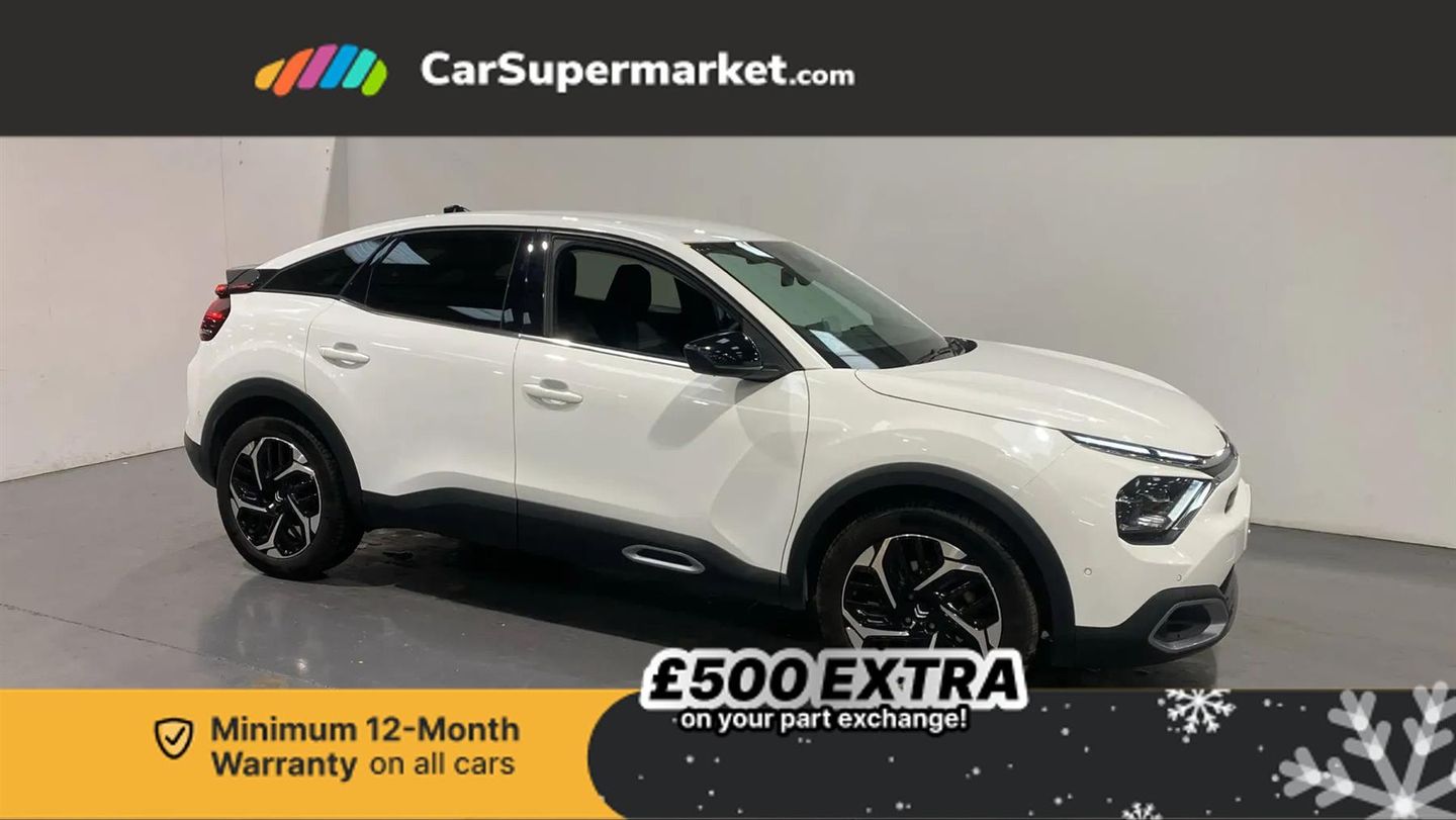 5.5 inch backlit full TFT driver's instrument cluster with LED ambient lighting,Active blind spot detection,Apple car play and Android auto,Citroen connect box emergency and assistance system,Citroen Smart Pad Support - integrated support for attaching a tablet computer for front passenger,Driver's head-up display,Electronic Power Steering (EPS),Front, rear and lateral parking sensors,In-crash braking,My Citroen Drive Plus: 10" high-resolution touchscreen user interface, controlling media, connectivity, vehicle settings + connected nav,Speed limiter,Tailgate,Voice commands,Advanced comfort suspension - double hydraulic stops on front and rear suspension,6 speakers,Bluetooth telephone and audio streaming,DAB Digital radio,3rd brake light,Automatic headlights,Body colour bumpers,Body colour door handles,Boot spoiler,C-Series badging on front wing,Dark tinted rear windows and side windows with chrome detail,Electrically heated, folding and adjustable external rear view mirrors with courtesy lighting,Electrochrome interior rear-view mirror with automatic day-night switching,Front and rear electric windows,Gloss black rear skirt,Intelligent beam headlights,LED daytime running lights in V signature,LED front fog lamps with static cornering function,LED front headlamps,Perla Nera black painted external rear view mirrors,Rain sensing automatic front windscreen wipers,Rear side wing doors,Rear wiper,Shark fin roof aerial,Welcome and goodbye lighting,12V power outlet, 1x USB Type-C socket & data connection, 1x USB Type-A socket at 1st row + 1x USB Type-A socket , 1x USB Type-C socket in 2nd row,3 rear headrests,3 seat bench in 2nd row,Alcantara and black leather effect textile seats,Boot light,Dashboard tray in front cabin,Deluxe leather steering wheel with two command blocks,Driver and passenger sunvisors with illuminated vanity mirrors,Dual zone automatic air conditioning,Electrically heated front seats,Front and rear LED interior lighting,Front head restraints,Heated steering wheel,Height adjustable driver's seat with adjustable lumbar support,Height adjustable front passenger seat,Height and reach adjustable steering wheel,Map pockets in rear of front seats,Raised centre console with armrest and two cup holders,Rear central folding armrest with cupholders and ski hatch,Single front passenger seat,Split folding rear seats,Two position boot floor,XXL storage in front cabin,High level acoustic insulation pack - C4/C4 X/e-C4 X,Safety pack plus - C4/C-Series Edition/Max,3x3 point rear seatbelts,ABS,Driver and front passenger airbags,Electric parking brake,ESP,Front seatbelt pretensioners,Hill start assist,Manual child lock in second row,Manual deactivation of front passenger airbag,Row 1 and 2 curtain airbags,Row 1 side thorax airbags,Seatbelt unfastened on the move warning,Tyre underinflation detection,Anti-theft alarm (volumetric protection),Immobiliser,Keyless entry and start,Remote locking with deadlocks,18" Bi-tone diamond-cut aeroblade alloy wheels with anti-theft locking wheel nuts,Puncture repair kit with compressor