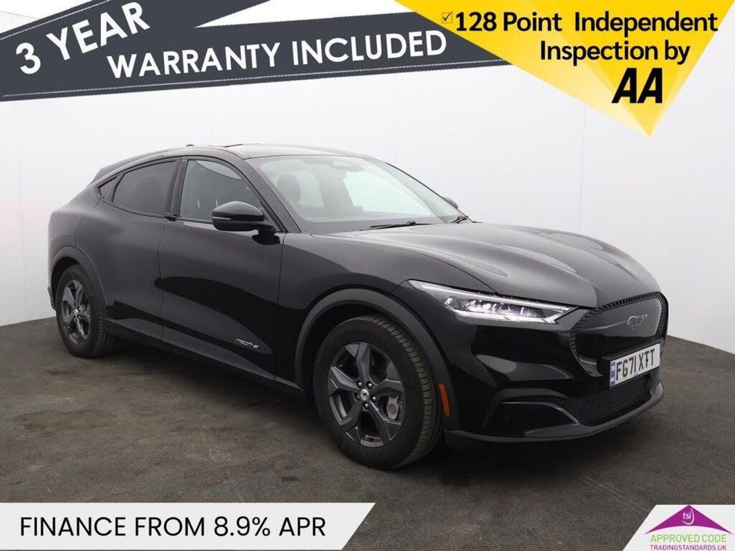 10.2in Full Digital Cluster and 15.5in Central Touch Screen, Applink Remote Control System, FordPass Connect Embedded Modem, SYNC with Connected Navigation and Natural Voice Search, Wireless Device Charging Pad, 18in Alloy Wheels - 5-Spoke - Silver, Body Colour Bumpers, Body Colour Heated Mirrors with Puddle Light Mustang Logo Projection, Brace Front Grille Design, Electric Windows - Front, Privacy Glass, Quickclear Heated Windscreen, Side Cladding and Wheel Arches in Black, 6-Way Manual Driver and Passenger Seats, Air Conditioning - Dual Zone Electronic Automatic Temperature Control, Front Trunk, Heated Driver and Passenger Seats, Heated Steering Wheel, One Pedal Drive, Absolute Black, High Power Charging Cable, Home Charging Cable, LED Mustang Signature Taillights, LED Reflector Headlamps, Power Steering, Sensico - Black Onyx with Grey Stitching, ABS - Anti-lock Braking System, Adaptive Cruise Control with Stop and Go and Lane-Centering, Airbags - Driver and Front Passenger, BLIS - Blind Spot Information System with Cross Traffic Alert, E-Latch Keyless Entry System including B-Pillar Keypad Access, Front and Rear Parking Sensors, Lane Keeping Aid with Lane Departure Warning, Pre-Collision Assist with Forward Collision Warning-Dynamic Brake Support-Autonomous Emergency Braking, Rear View Camera, Selectable Drive Modes - Active-Whisper-Untamed, Thatcham Category 1 Alarm