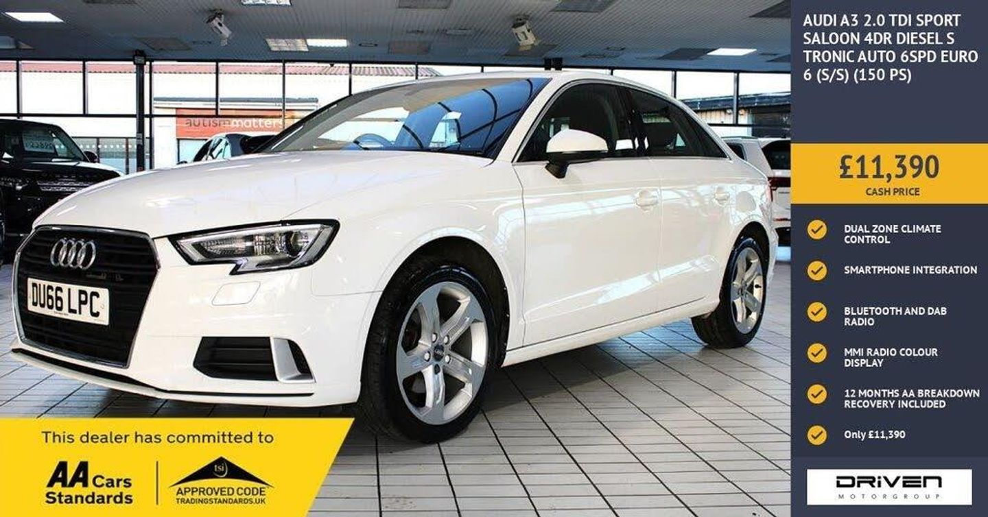AUDI A3 2.0 TDI SPORT SALOON 4DR DIESEL S TRONIC AUTO FINISHED IN IBIS WHITE AND COMPLIMENTED WITH ALCANTARA BLACK LEATHER INTERIOR, THIS VEHICLE HAS BEEN VERY WELL CARED FOR AND MAINTAINED WITH DOCUMENTED SERVICE HISTORY PLUS COMPREHENSIVE PRE DELIVERY HEALTH CHECK AND SERVICE COMPLETED PRIOR TO SALE AT 66249 MILES. KEY FEATURES INCLUDE ALLOY WHEELS, ALARM, AUDI SMARTPHONE INTEGRATION, BLUETOOTH, CD DRIVE, CRUISE CONTROL, AUX IN, DAB RADIO, ELECTRIC ADJUSTABLE HEATED DOOR MIRRORS WITH INTEGRATED LED INDICATORS, DUAL ZONE CLIMATE CONTROL, IMMOBILISER, SD CARD BASED SATALLITE NAVIGATION, MMI RADIO PLUS, RETRACTABLE COLOUR MMI SCREEN, XENON HEADLIGHTS PLUS MUCH MORE. COMMITTED TO AA CARS STANDARDS: 3 MONTHS OR 3000 MILES WARRANTY INCLUDED WITH AN OPTION TO UPGRADE: 12 MONTHS AA BREAKDOWN RECOVERY INCLUDED: £75.00 CONTRIBUTION TOWARDS YOUR NEXT SERVICE/MOT AT ANY AA CARS STANDARD APPROVED WORKSHOP: WE STAND BY THE QUALITY OF OUR VEHICLES. WITH THE PURCHASE OF THIS VEHICLE, YOU WILL RECEIVE 3 MONTHS OR 3000 WARRANTY, 12 MONTHS AA BREAKDOWN RECOVERY, GIVING YOU ADDITIONAL PEACE OF MIND AND PROTECTION. ALL OUR CARS COME WITH AT LEAST 6 MONTHS MOT AND PRE SALE HEALTH CHECK AND ROAD TEST. OUR PROFESSIONAL TEAM ENSURES YOUR VEHICLE STAYS IN TOP CONDITION, AND YOU ENJOY A HASSLE-FREE OWNERSHIP EXPERIENCE. 4.7 STARS ON GOOGLE WITH OVER 550 REVIEWS: JOIN OUR COMMUNITY OF SATISFIED CUSTOMERS! OUR DEALERSHIP IS PROUD TO HAVE A 4.7 STAR RATING ON GOOGLE, BACKED BY OVER 550 POSITIVE REVIEWS. WE ARE COMMITTED TO PROVIDING EXCELLENT SERVICE AND HIGH-QUALITY VEHICLES. This Vehicle Comes Equipped with High Specification, Which Includes: - Drive this car home with complete confidence and satisfaction: All cars proudly offered by driven group are rigorously inspected, hpi checked and prepared to the highest standard To drive this car home, visit www.drivegroup.co.uk or call 01642-601999 to arrange an appointment with our sales team Please note we do not operate an organised distance selling scheme as defined by the consumer contracts (cancellation, information and additional charges) regulations 2013. Therefore, even if you choose to not view your vehicle at our premises prior to purchase,you will not be entitled to cancel your order under any 14 day cancellation period. All other statutory rights remain unaffected. Whilst every effort has been made to ensure the accuracy of the information contained in this website, please check with us about any item which may affect your decision to purchase. Driven motor group shall not be liable for any errors, inaccuracies or delays in content.