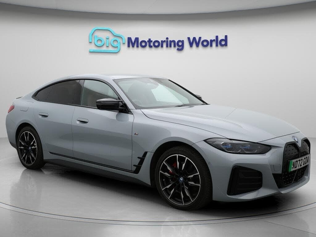 £750 towards your finance depo-Our BMW i4 comes with optional extras worth £4,880. Specification includes a range of fantastic features including £750 towards your finance deposit, All Wheel Drive, Sun Protection Pack, Head up Display, Leather Seats, Apple CarPlay, Adaptive Cruise Control, Electric Seats, Harman Kardon Speakers, Connected Package Professional Specification information is supplied by CAPHPI and may vary to the actual car. This data does not form any part of a buying contact. Please check specification prior to purchase in-store. The MOT is valid until November 2026, visit bigmotoringworld.co.uk for more photos, a 360 tour, service history and a free HPI report.Were BIG on peace of mind and this Grey BMW i4 has completed our comprehensive 200 point inspection and passed all checks. Its ready for you to drive away with immediate collection in-store. We include a 90-day warranty as standard plus an option to extend for up to 3 years.Reserve this car exclusively for you, safely and securely at bigmotoringworld.co.uk, with a fully refundable £99 deposit. Test drive before you buy, with no commitment, no hassle and a completely haggle free experience. Still searching and want to see thousands more cars? We are BIG on choice with over 8000 cars to choose from.Visit our award winning web site bigmotoringworld.co.uk.Were Big Motoring World and were BIG on what matters to you.