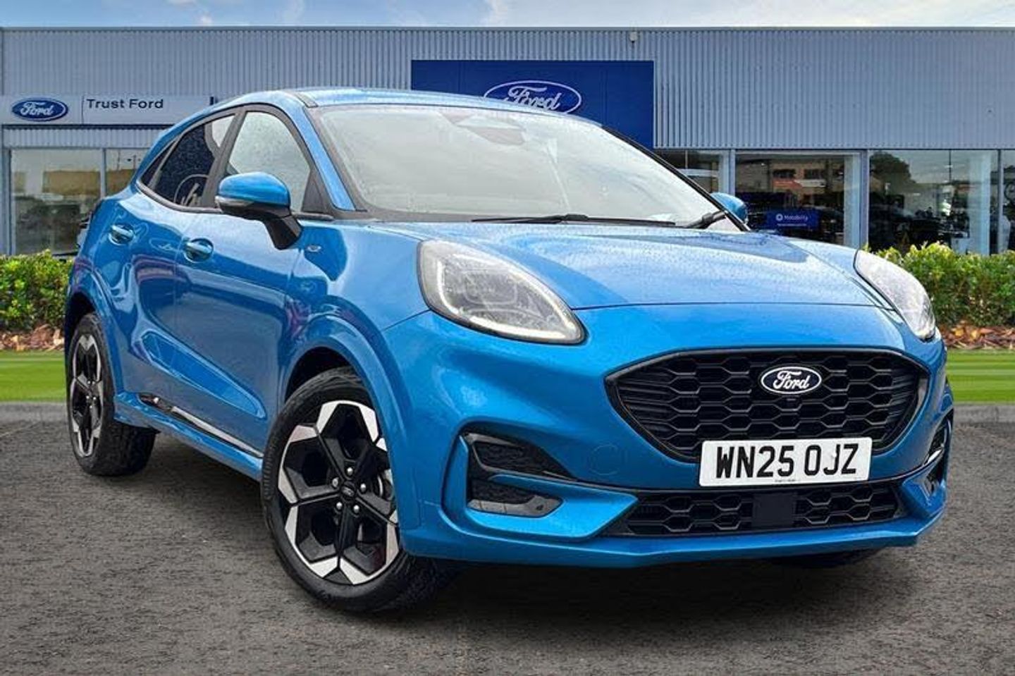 Driver impairment monitor, Emergency call service, Ford easy fuel, Full digital 12.8 instrument cluster, Lane keeping aid with lane departure warning, Power assist steering, Selectable drive modes(Normal, Eco, Sport, Slippery and Trail), Speed sign recognition, Automatic headlights with rain sensing wipers and auto high beam, Front fog lamps, LED daytime running lights, LED rear lamps, LED third brake light, Power foldable heated door mirrors with puddle lamps and puma logo protection, Quickclear heated windscreen, Rear privacy glass, Rear side wing doors, Rear wiper, ST-Line X body styling kit, 3 seat bench in 2nd row, 4 way lumbar support for passenger seat, Centre console with armrest and stowage, Electronic automatic temperature control (EATC), Ford megabox extended bootspace, Front and rear head restraints, Front floor mats, Manual 4 way driver seat adjust with lumbar adjustment, Single front passenger seat, ST-Line X Premium synthetic leather upholstery, 3 rear seatbelts, Child safety lock, Electronic stability control (ESC) and hill start assist, Pre-collision assist with autonomous emergency braking, pedestrian/cyclist detection & post-collision braking, Tyre pressure monitoring system (TPMS)