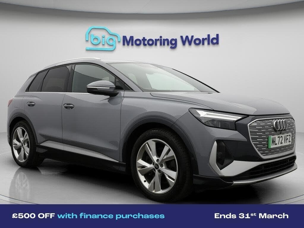 £500 towards your finance depo-Our Audi Q4 e-tron is finished in Grey. Specification includes a range of fantastic features including £500 towards your finance deposit, Part Leather Seats, Apple CarPlay, Lane Assist, S Line Body Styling, Android Auto, Satellite Navigation, Privacy Glass, Heated Seats, Rear View Camera Specification information is supplied by CAPHPI and may vary to the actual car. This data does not form any part of a buying contact. Please check specification prior to purchase in-store. The MOT is valid until September 2026, visit bigmotoringworld.co.uk for more photos, a 360 tour, service history and a free HPI report.Were BIG on peace of mind and this Grey Audi Q4 e-tron has completed our comprehensive 200 point inspection and passed all checks. Its ready for you to drive away with immediate collection in-store. We include a 90-day warranty as standard plus an option to extend for up to 3 years.Reserve this car exclusively for you, safely and securely at bigmotoringworld.co.uk, with a fully refundable £99 deposit. Test drive before you buy, with no commitment, no hassle and a completely haggle free experience. Still searching and want to see thousands more cars? We are BIG on choice with over 8000 cars to choose from.Visit our award winning web site bigmotoringworld.co.uk.Were Big Motoring World and were BIG on what matters to you.