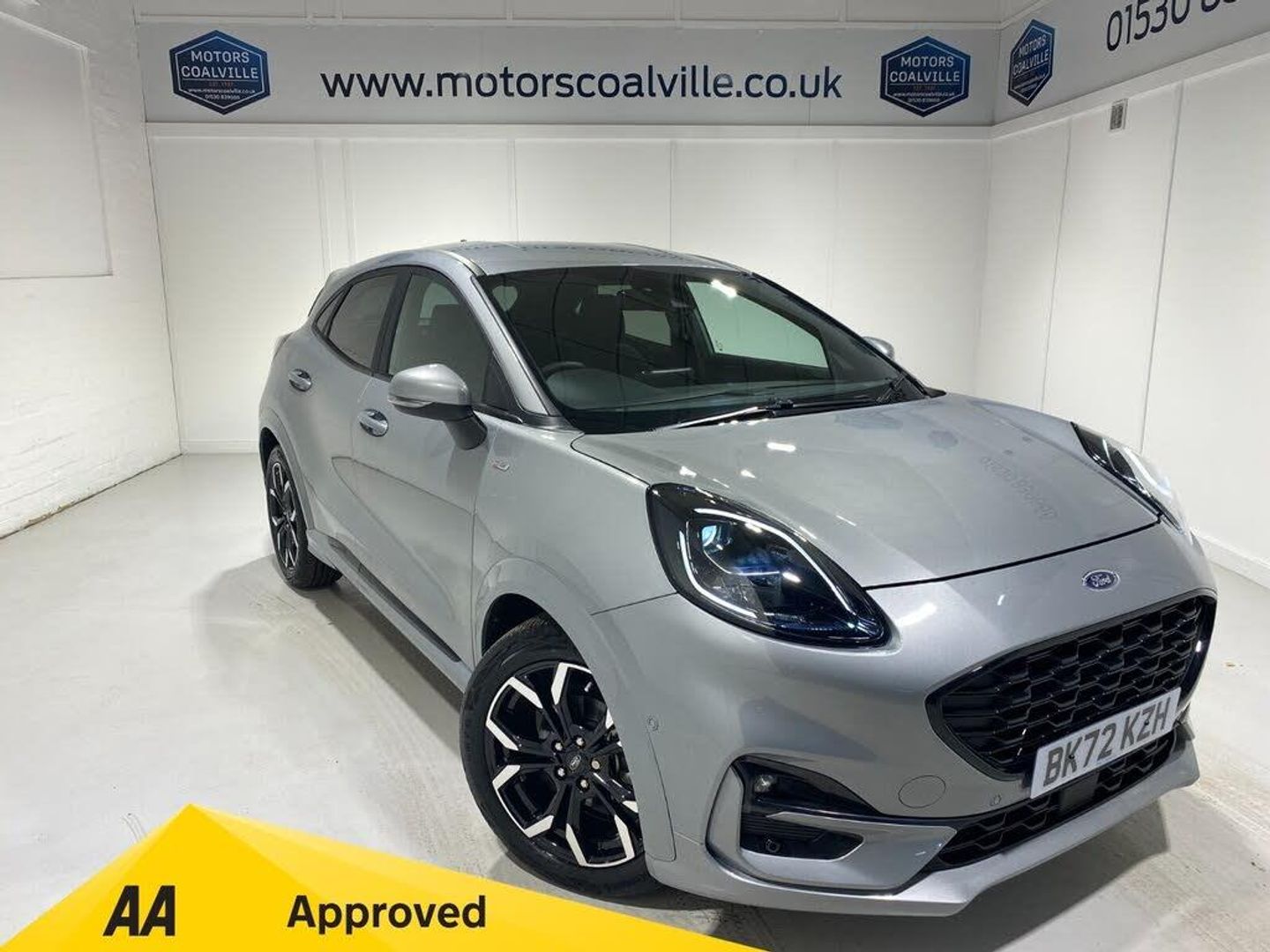 2022 72 Reg Ford Puma 1.0 EcoBoost mHEV (125PS) ST Line X AUTOMATIC 5dr. Solar Silver metallic with Part LEATHER/Cloth interior, ST -LINE BODY KIT with LARGE REAR SPOILER, SYNC 3 DAB SATELLITE NAVIGATION, DRIVERS ASSISTANCE PACK with BLIND SPOT INFORMATION with CROSS TRAFFIC ALERT, ADAPTIVE CRUISE CONTROL Pre COLLISION ASSIST, ACTIVE PARK ASSIST and REAR CAMERA, B&O sound system, selectable drive modes- Normal, Eco, Sport, Slippery & Trail, drivers & passenger seat lumbar & heights adjust, FORD MEGABOX EXTENDED BOOT SPACE, 18 inch Matt Black machined alloy wheels, EATC AIR CON, KEYLESS entry and start with FORD power start button, PRIVACY GLASS, power folding door mirrors, auto light and rain sensing wipers, tyre pressure monitoring system, Thatcham alarm, NCAP Pack (lane-keeping alert & lane-keeping aid, speed limiter, rear seat belt minder, rear centre head restraint & auto-headlamps), front fog lamps with cornering lights, heated front screen, remote central locking, electric front windows, ESP, Hill start assist, trip computer, ambient lighting, 2,089 miles (BK 72 KZH).