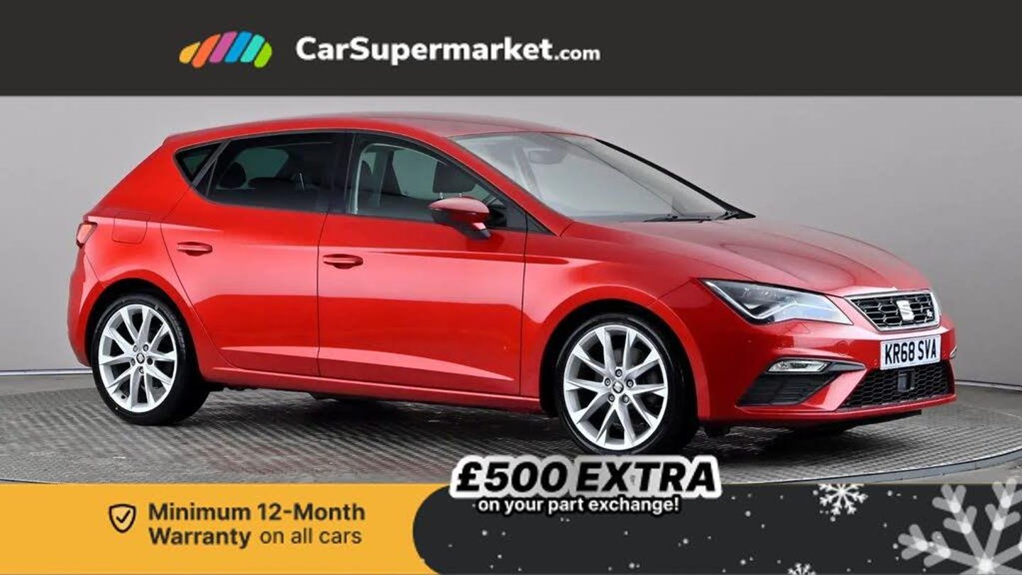 'Lights On' Reminder warning buzzer,3D map display,8" touch screen,Bluetooth Handsfree Phone Connection,Cruise control,Digital cockpit,Electro-mechanical power steering,Front and rear parking sensors,Front assist with pedestrian protection,Full Link Smartphone Integration with Mirror Link, Apple Car Play, Google Android Auto,Low fuel warning light,Navigation system (incl. media system plus),Outside temperature gauge,RPM counter,SEAT Drive profile,SEAT logo boot release,Service interval indicator,Trip computer,Voice recognition,Dynamic chassis control,Lowered sports suspension,XDS electronic differential lock,2x SD card slot,4 USB,8 Speakers,Auxiliary input socket,Bluetooth audio streaming,CD player,DAB Digital radio,High resolution colour driver display,Media system plus (incl. media system colour),Steering wheel mounted audio/phone controls,Aluminium front door sills,Black radiator grille,Body colour door handles,Body coloured bumpers,Body coloured exterior mirrors with integrated LED indicators,Chrome-plated radiator grille surround,Dark tinted rear windows,Electric front/rear windows,Electrically adjustable door mirrors,Electrically foldable exterior mirrors with parking position and passenger-side mirror with lowering function,Exclusive FR front and rear bumpers,Heated door mirrors,High gloss black finish B and C pillars,Illuminated aluminium front door sill with FR logo,LED front fog lights,LED headlights with LED day time running lights + LED rear lights + LED number plate lights,Rear wash/wipe,Visible twin exhaust tailpipes,12v power point in centre console,60/40 split folding rear seat,Active front headrests and 3 rear headrests,Additional heating and ventilation outlet in rear of centre console,Boot storage net,Cargo rings in boot,Driver and passenger seat height adjust,Driver seat lumbar adjustment,Dual zone climate control,Dust/pollen filter,Flat bottomed perforated leather steering wheel with red stitching and FR logo,Front adjustable head restraints,Front armrest with storage box,Front cupholders x 2,Front seatback storage pockets,Front sport seats in leather,Front/rear floor mats,Gear shift indicator,Height/reach adjust steering wheel,High centre console with integrated box & cup holder, rear air outlet, with armrest in front seats,Illuminated door sills,Instrument lighting with brightness control,Luggage tie-down hooks,Multi-colour ambient interior lighting,Passenger seat lumbar adjust,Rear top tether child seat ISOFIX attachment,Steering wheel gearshift paddles,Storage box under drivers seat,Winter pack - Leon,3 point seatbelts on all rear seats,7 airbags - 2 front, 2 front side, 2 curtain, 1 knee,ABS + TCS,Child proof door locks,Electric handbrake,Electronic parking brake with auto hold,ESC with tyre pressure warning indicator,ESP+EBA,Front seatbelt pretensioners,Front seatbelt reminder,Hill hold control,Manual passenger airbag deactivation function,Multi-Collision braking,2 folding remote keys with window open/close function and boot opening/door mirror folding function,Central locking fuel filler cap,Engine immobiliser,Locking wheel bolts,Remote central locking + deadlocks,Volumetric alarm with back up horn,Chrome interior detailing,18" Performance Alloy wheels 30/1