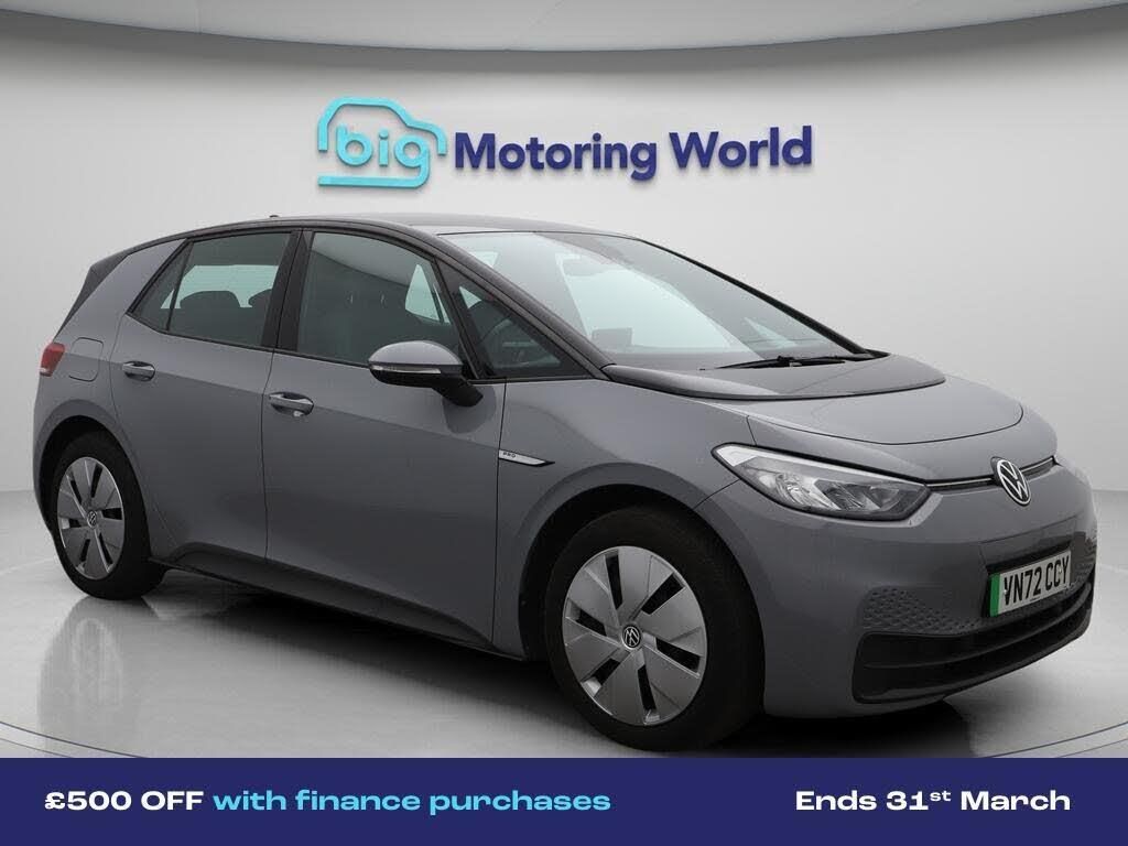 £500 towards your finance depo-Our Volkswagen ID.3 is finished in Grey. Specification includes a range of fantastic features including £500 towards your finance deposit, Comfort Pack, Apple CarPlay, Adaptive Cruise Control, Lane Assist, Android Auto, Privacy Glass, Heated Seats, Gesture Control, Heated Steering Wheel Specification information is supplied by CAPHPI and may vary to the actual car. This data does not form any part of a buying contact. Please check specification prior to purchase in-store. The MOT is valid until October 2026, visit bigmotoringworld.co.uk for more photos, a 360 tour, service history and a free HPI report.Were BIG on peace of mind and this Grey Volkswagen ID.3 has completed our comprehensive 200 point inspection and passed all checks. Its ready for you to drive away with immediate collection in-store. We include a 90-day warranty as standard plus an option to extend for up to 3 years.Reserve this car exclusively for you, safely and securely at bigmotoringworld.co.uk, with a fully refundable £99 deposit. Test drive before you buy, with no commitment, no hassle and a completely haggle free experience. Still searching and want to see thousands more cars? We are BIG on choice with over 8000 cars to choose from.Visit our award winning web site bigmotoringworld.co.uk.Were Big Motoring World and were BIG on what matters to you.