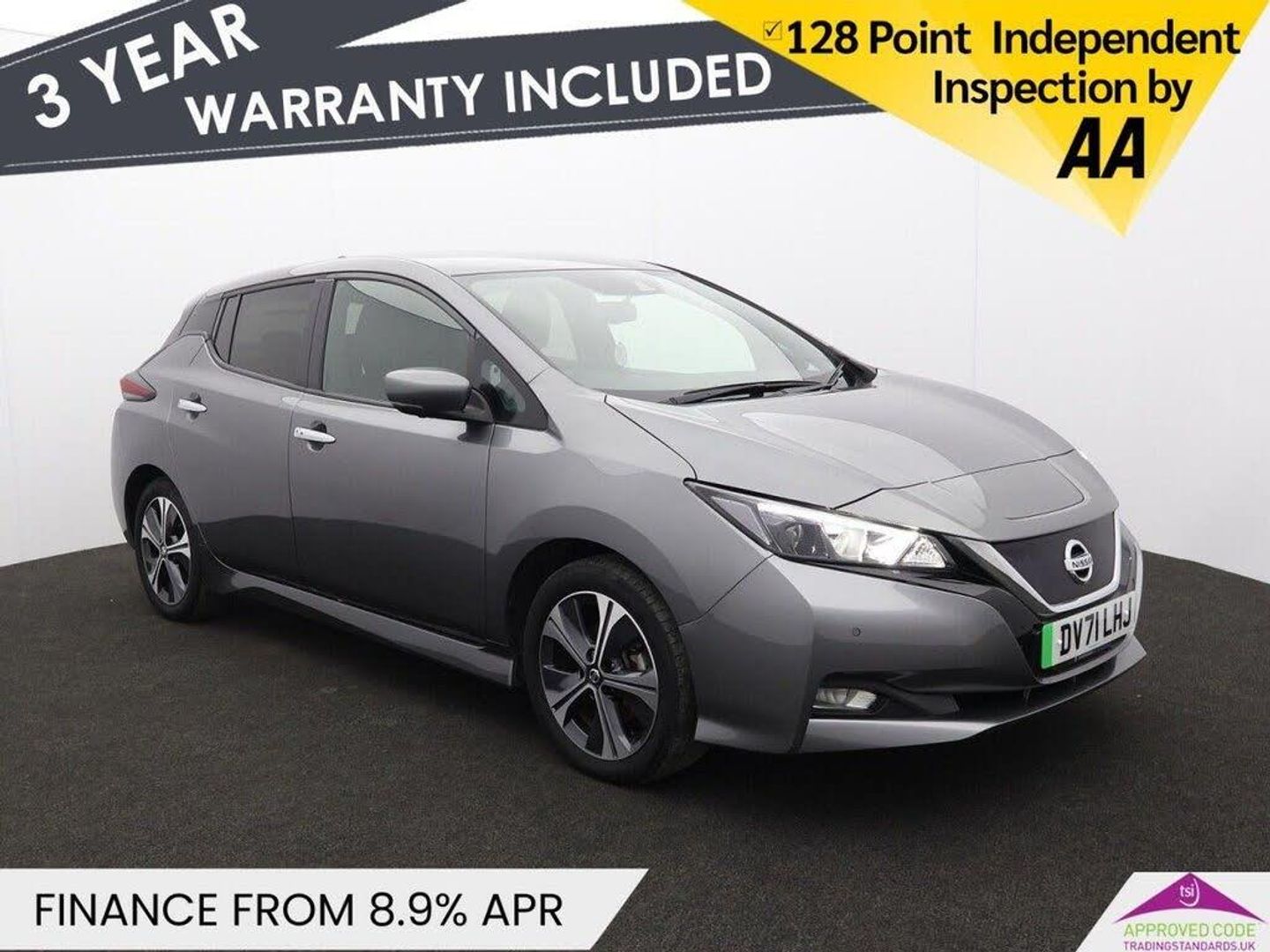 12V Socket, 8in Touchscreen Entertainment System, Audio System with 6 Speakers, DAB Radio with Apple CarPlay and Android Auto, Nissan Connect Services, NissanConnect Satellite Navigation System, Shark Fin Antenna, USB Port, 17in Alloy Wheels, Body Coloured Door Mirrors, Door Handles - Chrome, Electric Folding Door Mirrors, Front and Rear Electric Windows, Gloss Black B-pillar, Integrated Turn Signals in Mirrors, Metallic Blue Rear Bumper Accents, Rear Privacy Glass, 7in Combimeter, Auto Dimming Rear View Mirror, Automatic Air Conditioning, Front Seat Back Pockets, Heat Pack, Illuminated Charge Port, Leather Steering Wheel, Manually Adjustable Drivers Seat - Slide - Recline and Lifter, Manually Adjustable Passenger Seat - Slide and Recline, Rain Sensing Windscreen Wipers, Steering Column - Rake and Reach, Tech Pack, Synthetic Leather-Cloth - Black, Gun Metallic, 50kW CHAdeMO Quick Charger, 6.6kW AC On Board Charger, E-Pedal, Electric Power Steering, EVSE 6M or Mode 3 - 6M, Front Fog Lights, Halogen Headlamps with LED Signature, Headlights - Follow Me Home Function, Headlights - High Beam Assist, Heat Pump, Intelligent Auto Headlights, LED Signature Tail Lights, Speed Limiter, 6 Airbags, Alarm - Thatcham, Anti Lock Braking System - ABS, Auto Hazard Lights, Blind Spot Intervention, Blind Spot Warning, Electric Parking Brake, Hill Start Assist, Intelligent Cruise Control, Intelligent Emergency Braking with Pedestrian Recognition, Intelligent Lane Intervention, Intelligent Trace Control, ISOFIX on Rear, Lane Departure Warning, Nissan i-Key and Start Push Button, Rear Cross Traffic Alert