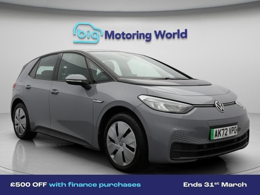 £500 towards your finance depo-Our Volkswagen ID.3 is finished in Grey. Specification includes a range of fantastic features including £500 towards your finance deposit, Adaptive Cruise Control, Lane Assist, Satellite Navigation, Heated Seats, Heated Steering Wheel, Bluetooth, Blind Spot Assist, Parking Sensors, 2 Zone Climate Specification information is supplied by CAPHPI and may vary to the actual car. This data does not form any part of a buying contact. Please check specification prior to purchase in-store. The MOT is valid until November 2026, visit bigmotoringworld.co.uk for more photos, a 360 tour, service history and a free HPI report.Were BIG on peace of mind and this Grey Volkswagen ID.3 has completed our comprehensive 200 point inspection and passed all checks. Its ready for you to drive away with immediate collection in-store. We include a 90-day warranty as standard plus an option to extend for up to 3 years.Reserve this car exclusively for you, safely and securely at bigmotoringworld.co.uk, with a fully refundable £99 deposit. Test drive before you buy, with no commitment, no hassle and a completely haggle free experience. Still searching and want to see thousands more cars? We are BIG on choice with over 8000 cars to choose from.Visit our award winning web site bigmotoringworld.co.uk.Were Big Motoring World and were BIG on what matters to you.
