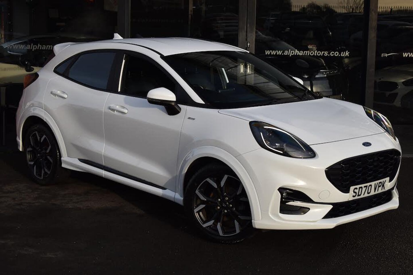 18in Alloy Wheels - 5-Spoke - Matt Black Machined Finish,ABS - Anti-lock Braking System,Acoustic Laminated Windscreen,Active Grille Shutter,Automatic Dimming Rear View Mirror,Automatic Headlights with Rain-Sensing Wipers and Auto High Beam,B&O Premium Audio System and Ford SYNC 3 Navigation,Carbon-Look Interior Deco Spears,Centre Console with Armrest - Stowage,Courtesy Lights - Ambient LED Courtesy Lighting - Single Colour,Cruise Control - Lane Keeping Aid and Lane Departure Warning,Driver and Passenger Seat Lumbar and Height Adjustment,Electric Windows - Front and Rear,Electronic Air Temperature Control - EATC,Electronic Stability Control - ESC with Traction Control and Emergency Brake Assist - EBA,Emergency Brake Warning - Automatic Hazard Warning Lights,First Aid Kit Strap,Floor Mats - Front and Rear,Ford Easy Fuel System,Ford MegaBox Extended Bootspace,Ford Power Starter Button,Front Bumper - Unique ST-Line Sport Design - Body Colour,Front Door Threshold Plates - ST-Line,Front Fog Lights with Cornering lights and LED Rear Lamps,Front Seats - Sports Style,Full Digital 12.3in Instrument Cluster,Gearshift Knob - Soft Feel with Red Stitching,Headliner - Deluxe,Instrument Panel - High Level,Large Rear Spoiler - Body Colour with Centre High Mounted Stop Light,Locking Wheel Nuts,Lower Bodyside Moulding - Body Colour,Post Collision Braking,Power Steering,Power-Foldable Heated Door Mirrors with Puddle Lamps,Pre-Collision Assist with Autonomous Emergency Braking and Pedestrian-Cyclist Detection,Privacy Glass,Projector Headlamps with LED Daytime Running Lights,Puma Badge,Quickclear Heated Windscreen,Rear Bumper Body Colour - Diffuser,Rear Parking Sensors,Rear Seats - 2-Way Head Restraint Up-Down,Rear Seats - Second Row 60-40 Folding Seats,Remote Central-Double Locking,Restrain Device Pack,ST-Line Badge,ST-Line Body Styling Kit,ST-Lined Flat-Bottomed Leather Steering Wheel - Leather Handbrake and Aluminium Gear Knob,Selectable Driving Modes - Normal - Eco - Sport - Slippery and Trail,Speed Limiter,Sports Suspension,Stainless Steel Pedal Covers with Rubber Inserts,Thatcham Alarm,Trip-Fuel Computer,Tyre Inflation Kit,Tyre Pressure Monitoring System - TPMS,Wireless Charging,Frozen White,Partial Premium Sensico - Black with Red Stitching