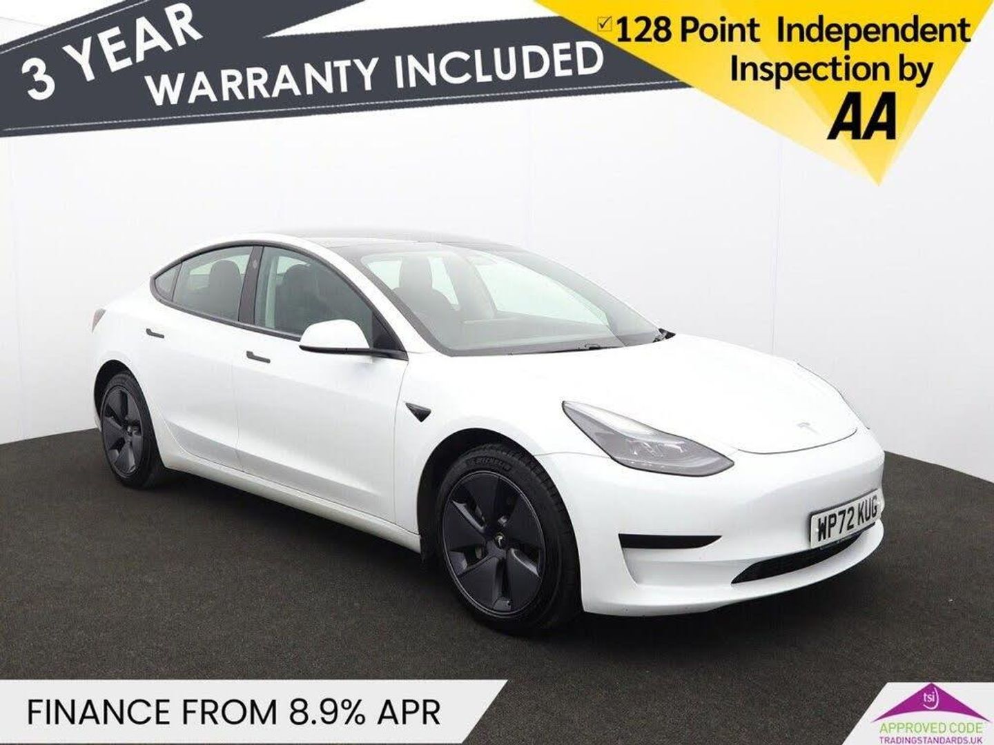 This 2022 Tesla Model 3 is a superb example, having had only one owner since new. As an electric vehicle, it boasts a 62 kWh battery offering an impressive maximum range of 317 miles when new. Charging is convenient, with a full charge at home on a 7kW charger taking approximately 8 hours, and a rapid charge from empty to 80% achievable in just 29 minutes at a public charging station. Inside, you'll find a comfortable and well equipped cabin featuring 2 Zone Climate Control, Adaptive Cruise Control, heated front and rear seats, and air conditioning. The large boot space provides ample room for luggage or shopping, making this Model 3 a practical choice for everyday use and longer journeys. The combination of its extensive electric range, rapid charging capabilities, and desirable features like heated seats and adaptive cruise control sets this Tesla apart, offering a refined and efficient driving experience that is both modern and economical. Oakwood Motor Company are an established family run dealership, home of the best used cars in Bury! We have hundreds of cars currently in stock from all your favourite brands including our specialist selection of Audi VW Group vehicles. Our fantastic rates are available on both HP and PCP finance, and we have extended warranties available for up to 3 years for complete peace of mind. Our experienced sales team are on hand to help you every step of the way, so give us a call today to reserve your new car with a refundable £100 deposit. Visit our used car dealership in Bury! We take all reasonable steps to ensure the accuracy of the information supplied in our advertising materials, however on occasion errors may occur. Images used are for illustrative purposes only. Please ensure you take the time to fully inspect your vehicle for specification/features which are important to you, and raise any queries with your Sales Executive.