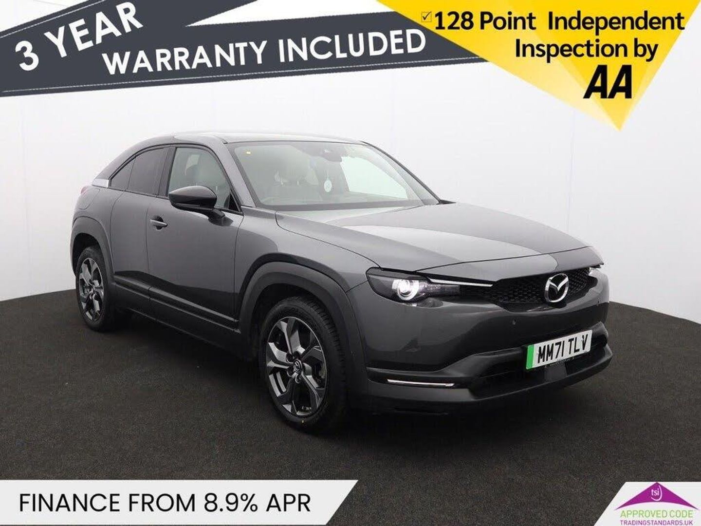 7in Colour Touch Screen for Climate Control Settings, 8.8in TFT Colour Centre Display with Mazda Connect Infotainment, AM-FM-DAB Radio - MP3 with 8 Speakers, Apple CarPlay and Android Auto, DC Socket for Rapid Charging up to 50KW, e-Call with GPS, Integrated Bluetooth, Mazda Navigation System, Mobile Phone App Interface, OEM Sound System, USB - iPod Connectivity, USB and 12v Outlet, 18in Alloy Wheels - Bright, Auto Dimming Drivers Door Mirror, Bumpers - Body Coloured, Door Mirrors - Electrically Adjustable - Heated - Power Folding with Integrated Indicator Lights - Painted Black, Electric Windows - Front, Privacy Glass - Rear, Radiator Grille - Black, Satin Trim on D Pillar, Window Trim - Piano Black, Air Conditioning - Climate Control, Chrome Glove Box Handle, Chrome Start Button, Engine Start-Stop Button, Frameless Auto Dimming Rear-View Mirror, Front and Rear Centre Armrest, Front Head Restraints, Front Passenger Seat - Manual Height Adjustment, Head Restraints - Rear, Instrument Panel 7in TFT Colour Driver Display, Leather-Wrapped Steering Wheel and Shift Lever with Telescopic and Tilt Adjustment, Luggage Compartment - Tonneau Cover, Rain-Sensing Front Wipers, Seats - 60-40 Split Folding Rear, Seats - Driver Electric 8-Way Power Adjustment with Memory, Seats - Drivers Power Lumbar Adjustment, Seats - Front Heated, Steering Wheel - Paddle Shift, Steering Wheel Chrome Centre Bezel, Steering Wheel Mounted Audio and Bluetooth Controls, Automated High-Beam Assist, Dusk Sensing Automatic Headlights, Headlights - LED, Leatherette-Cloth - Light Grey with Stone, LED 3rd Brake Light, LED Daytime Running Lights, LED Rear Combination Lights, Machine Grey, Power Steering, Type 2 for Mode 3 AC Charging Via Home or Public Charge Points, Type 2 Mode 2 AC Charging Via 3-Point Plug, 3x 3-Point Rear Seat Belts, ABS - Anti Lock Braking System, Airbags - Driver, Airbags - Rear, Blind Spot Monitoring with Rear Cross Traffic Alert, Digital Instrument Cluster, Driver Attention Alert - DAA, Drivers Knee Airbags, Electronic Parking Brake with Auto Hold Function and Auto-Disengage Function, Emergency Lane Keeping with Blind Spot Assist, ESP - Electronic Stability Control, Front - Side and Curtain Airbags, Front Passenger Airbag, Front Smart Brake Support with Pedestrian Detection, G-Vectoring Control Plus - GVC Plus, Hill Hold Assist, Internal Combustion Engine Sound Emulator, ISOFIX Child Seat Anchorage for Outer Rear Seats, Lane Departure Warning System, Lane Keep Assist System, LED Indicator Lights, Mazda Radar Cruise Control with Intelligent Speed Assist, Multimedia Commander including Separate Volume Dial, Parking Sensors - Front and Rear, Rear Wiper, Remote Central Locking with Deadlocking and Automatic Door Lock when Driving, Reverse Parking Aid, Reversing Camera, Service Indicator, Smart Brake Support with Turn Across Traffic, Smart Keyless Entry, TCS - Traction Control System, Thatcham Accredited Alarm and Immobiliser, Trip Computer, Tyre Pressure Monitoring System, Window Projection Colour Active Driving Display with Traffic Sign Recognition