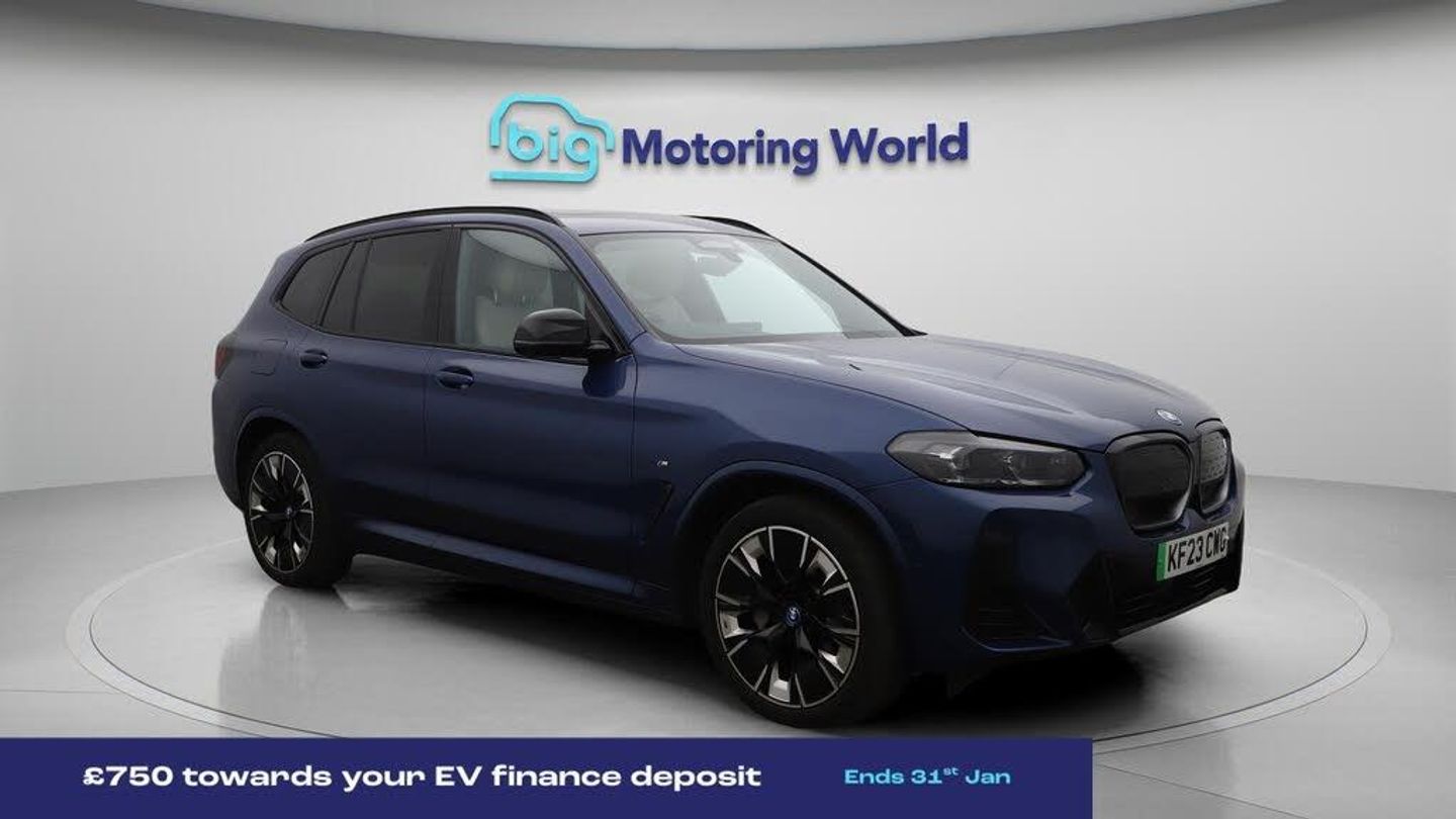 £750 towards your finance depo-Our BMW iX3 is finished in Blue. Specification includes a range of fantastic features including £750 towards your finance deposit, Sun Protection Pack, Head up Display, 20'' Alloy Wheels, Leather Seats, Apple CarPlay, Adaptive Cruise Control, Electric Seats, Harman Kardon Speakers, Electric Panoramic Roof Specification information is supplied by CAPHPI and may vary to the actual car. This data does not form any part of a buying contact. Please check specification prior to purchase in-store. The MOT is valid until July 2026, visit bigmotoringworld.co.uk for more photos, a 360 tour, service history and a free HPI report.Were BIG on peace of mind and this Blue BMW iX3 has completed our comprehensive 200 point inspection and passed all checks. Its ready for you to drive away with immediate collection in-store. We include a 90-day warranty as standard plus an option to extend for up to 3 years.Reserve this car exclusively for you, safely and securely at bigmotoringworld.co.uk, with a fully refundable £99 deposit. Test drive before you buy, with no commitment, no hassle and a completely haggle free experience. Still searching and want to see thousands more cars? We are BIG on choice with over 8000 cars to choose from.Visit our award winning web site bigmotoringworld.co.uk.Were Big Motoring World and were BIG on what matters to you.