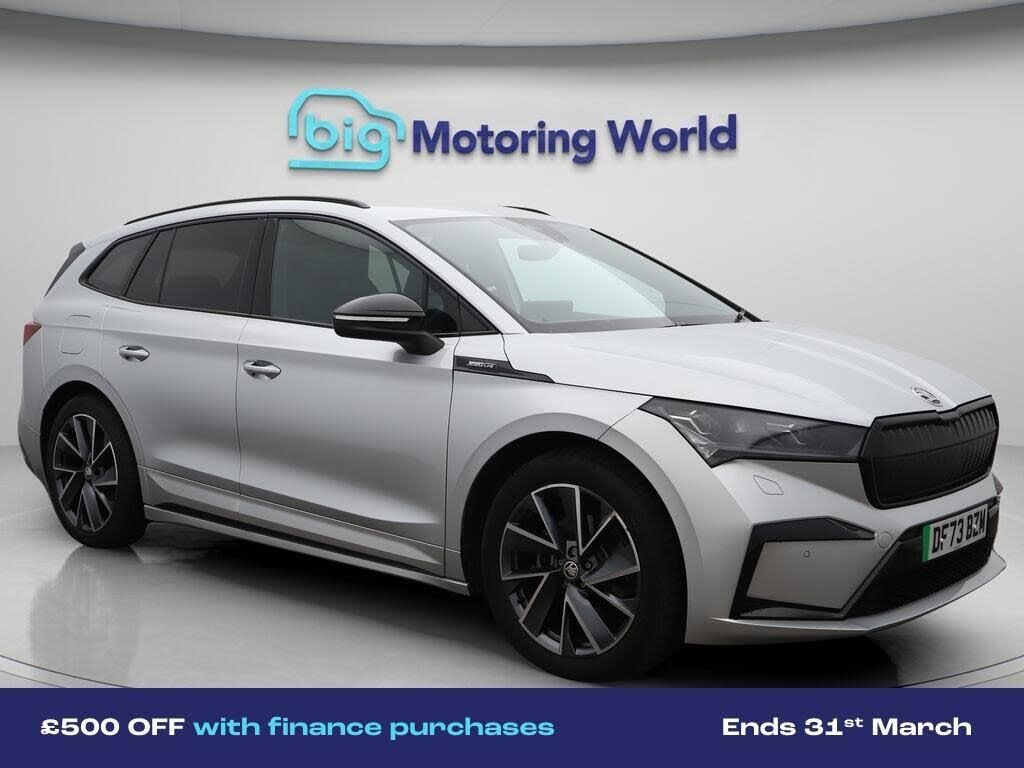 £500 towards your finance depo-Our Skoda Enyaq is finished in Silver. Specification includes a range of fantastic features including £500 towards your finance deposit, Lane Assist, Cooled Glovebox, Satellite Navigation, Privacy Glass, Heated Seats, Gesture Control, Rear View Camera, Heated Steering Wheel, Bluetooth Specification information is supplied by CAPHPI and may vary to the actual car. This data does not form any part of a buying contact. Please check specification prior to purchase in-store. The MOT is valid until December 2026, visit bigmotoringworld.co.uk for more photos, a 360 tour, service history and a free HPI report.Were BIG on peace of mind and this Silver Skoda Enyaq has completed our comprehensive 200 point inspection and passed all checks. Its ready for you to drive away with immediate collection in-store. We include a 90-day warranty as standard plus an option to extend for up to 3 years.Reserve this car exclusively for you, safely and securely at bigmotoringworld.co.uk, with a fully refundable £99 deposit. Test drive before you buy, with no commitment, no hassle and a completely haggle free experience. Still searching and want to see thousands more cars? We are BIG on choice with over 8000 cars to choose from.Visit our award winning web site bigmotoringworld.co.uk.Were Big Motoring World and were BIG on what matters to you.
