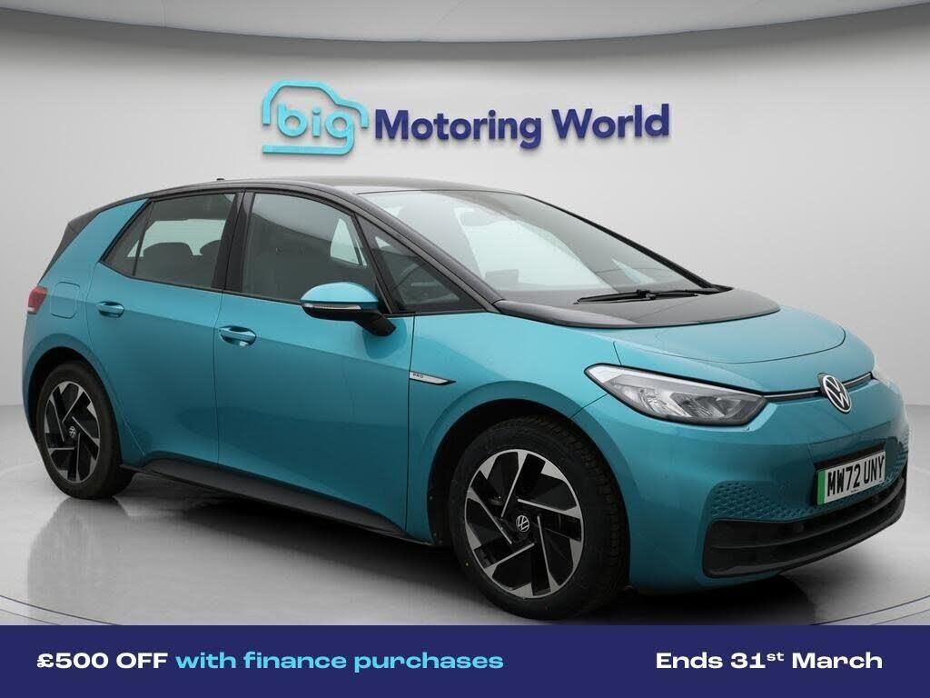 £500 towards your finance depo-Our Volkswagen ID.3 is finished in Turquoise. Specification includes a range of fantastic features including £500 towards your finance deposit, 18'' alloy wheels, Apple CarPlay, Adaptive Cruise Control, Lane Assist, Android Auto, Satellite Navigation, Heated Seats, Heated Steering Wheel, Bluetooth Specification information is supplied by CAPHPI and may vary to the actual car. This data does not form any part of a buying contact. Please check specification prior to purchase in-store. The MOT is valid until November 2026, visit bigmotoringworld.co.uk for more photos, a 360 tour, service history and a free HPI report.Were BIG on peace of mind and this Turquoise Volkswagen ID.3 has completed our comprehensive 200 point inspection and passed all checks. Its ready for you to drive away with immediate collection in-store. We include a 90-day warranty as standard plus an option to extend for up to 3 years.Reserve this car exclusively for you, safely and securely at bigmotoringworld.co.uk, with a fully refundable £99 deposit. Test drive before you buy, with no commitment, no hassle and a completely haggle free experience. Still searching and want to see thousands more cars? We are BIG on choice with over 8000 cars to choose from.Visit our award winning web site bigmotoringworld.co.uk.Were Big Motoring World and were BIG on what matters to you.