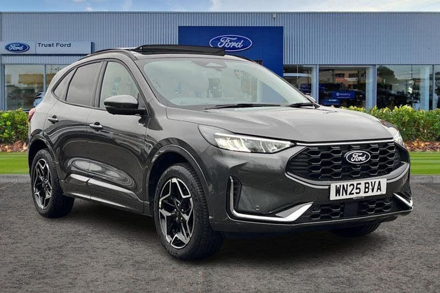 12.3 digital colour instrument cluster, 360 degree view camera, Clear exit assist, Cross traffic alert with active braking, e-Call (emergency call), Ford easy fuel, Ford SYNC 4 Navigation with 13 touchscreen, DAB radio, emergency assistance, Andriod Auto/Apple CarPlay, 5G modem & Ford Pass connect, Front and rear parking sensors, Hands free power tailgate, Lane centering assist, Lane keeping aid with lane departure warning, Power assist steering, Selectable drive modes, Service interval indicator, Auto headlamps with high and low beam, Black roof rails, Body colour bumpers, Front LED fog lamps, Large rear spoiler, LED daytime running lights, LED rear lights, LED third brake light, Pop out door edge protectors, Power front/rear windows with global close, Power heated folding door mirrors with puddle lights, memory function and camera, Power opening panoramic roof, Quickclear heated windscreen, Rain sensing wipers, Rear privacy glass, Rear side wing doors, Rear wiper, ST-Line body styling kit, 2nd row sliding seats, Electronic automatic temperature control (EATC), Front and rear head restraints, Partial premium touch sensico upholstery, Rear centre head restraint, Single front passenger seat, Sports seats, 3x3 point rear seatbelts, Airbags - front driver/passenger, front and rear curtain, Drivers knee airbag, Dynamic brake support, Electronic stability control (ESC) and ABS, Evasive steering assist, Ford MyKey Gen 2 safety system, Manual child proof rear door locks, Pre collision assist with autonomous emergency braking, Rear seat Occupancy alert, Red brake calipers, Tyre pressure monitoring system