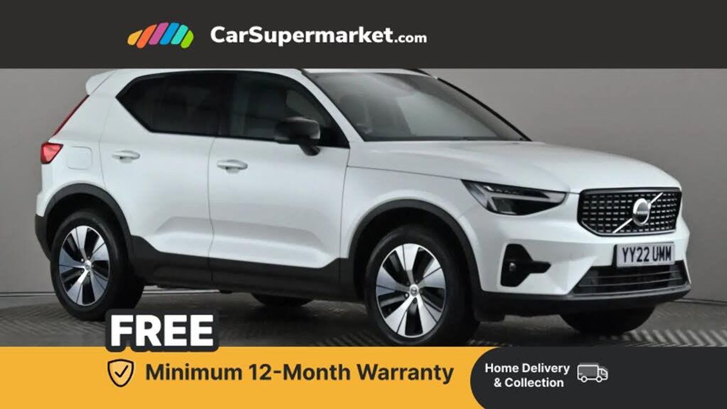 12.3" Active TFT crystal driver's instrument display,9" centre console portrait touch screen,Adjustable steering wheel force,Bluetooth hands free telephone kit,Drive mode selector,E-call,eCall emergency call system,Front park assist,Hands free power tailgate,Lane keep assist with driver alert control,Oncoming Lane Mitigation,Rear park assist,Sensus navigation with European mapping and traffic information,Speed limiter,Speed sensitive steering,Voice activated control for key functions,Wireless Smartphone Integration includes Apple CarPlay and Android auto,Wireless/Inductive Mobile Phone Charging,3.7 kW monophase on board charger,7m 10amp charge cable with 3 pin plug and 7m 1 phase 16amp type 2/mode 3 charge cable,Dynamic chassis,Electric front axle drive,Recharging port located in nearside front wing,DAB Digital radio,Low speed exterior sound speaker,Sensus connect with high performance sound, 8 speakers/250W, front USB and 2 rear type C USB,Steering wheel mounted remote controls,Adaptive brake lights with high level LED brake lights,Auto dimming interior mirror,Automatic headlamp levelling,Automatic LED Headlights + Active high beam incorporating daytime running lights,Front and rear electric windows,Front recharge aluminium tread plates,High gloss black front and rear skid plate,High gloss black mesh front grille with high gloss black surround,High gloss black window trim,Home safe and approach lighting,Integrated roof rails in high gloss black,LED front fog lights,Puddle lights,Rain sensor with automatic windscreen wiper activation,Rear side wing doors,Rear wiper,Roof antenna,Roof spoiler,Visible VIN plate,12V socket in front tunnel console and luggage compartment,2-Zone electronic climate control with CleanZone air quality system and pollen filter,3 seat bench in 2nd row,3 Spoke tailored steering wheel with chrome trim,60/40 versatile split folding rear seat,A-pillar parking ticket holder,Ambient front door and instrumental panel lighting,C-pillar Recharge logo,Centre console cupholders and storage,Front door pocket and front cupholder illumination,Front footwell illumination,Front headrests,Front reading light and theatre lighting,Front seat cushion extensions,Front tunnel pocket,Glovebox bag hook,Height adjustable passenger seat,Height/reach adjustable steering column,High gloss centre tunnel deco,Illuminated glovebox,Illuminated luggage compartment,Illuminated tailgate,Illuminated vanity mirrors,Isofix attachments on outer rear seats,Load protection net,Multi directional lumbar support,Power driver seat with memory + exterior mirrors memory,Rear armrest / integral cup holders / storage tray,Rear headrests,Rear reading and courtesy lights,Single front passenger seat,Underfloor cargo storage,Climate pack - XC40,3x3 point rear seatbelts,City safety includes pedestrian, cyclist and large animal detection and front collision warning with full auto brake,Drivers knee airbag,Dual stage driver/passenger airbags,Electronic parking brake with auto hold,First aid kit,Front and outer rear seatbelt reminder and pretensioners,Front seats SIPS airbags,Hill descent control,Hill start assist,Inflatable curtain,Passenger airbag cut-off device,Power child locks on rear doors,Road sign information display,Run off Road Mitigation,Run off Road Protection,SIPS (Side Impact Protection System),Slippery road and hazard light alert,Stability and Traction Control with Spin control, Engine Drag Control and Corner Traction Control,Tyre pressure monitoring system,Vehicle deceleration control with Anti-lock Brake System, Electronic Brake Distribution and Emergency Brake Assist,Warning triangle,WHIPS whiplash protection system - front,Anti-theft alarm including immobiliser/volume sensor + level sensor,Care key with user defined top speed,Key integrated remote control central locking + fuel flap with deadlocking system and auto open/close power windows,Keyless drive includes keyless entry and keyless start,Locking wheel nuts,Private locking for tailgate,Crystal White,Retractable Towbar