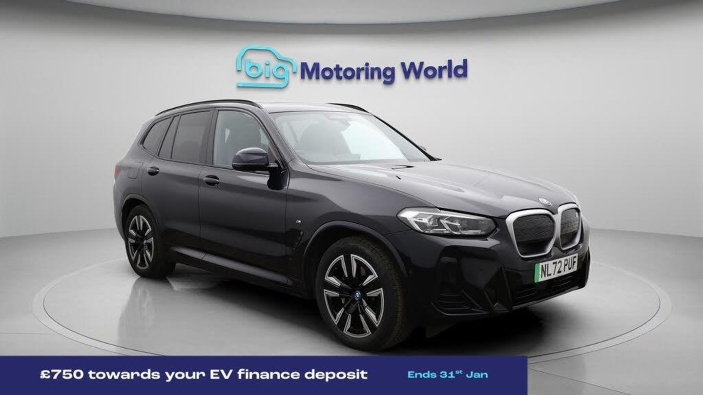 £750 towards your finance depo-Our BMW iX3 is finished in Black. Specification includes a range of fantastic features including £750 towards your finance deposit, Sun Protection Pack, 19'' Alloy wheels, Leather Seats, Apple CarPlay, Adaptive Cruise Control, Electric Seats, Harman Kardon Speakers, Electric Panoramic Roof, M Sport Bodykit Specification information is supplied by CAPHPI and may vary to the actual car. This data does not form any part of a buying contact. Please check specification prior to purchase in-store. The MOT is valid until September 2026, visit bigmotoringworld.co.uk for more photos, a 360 tour, service history and a free HPI report.Were BIG on peace of mind and this Black BMW iX3 has completed our comprehensive 200 point inspection and passed all checks. Its ready for you to drive away with immediate collection in-store. We include a 90-day warranty as standard plus an option to extend for up to 3 years.Reserve this car exclusively for you, safely and securely at bigmotoringworld.co.uk, with a fully refundable £99 deposit. Test drive before you buy, with no commitment, no hassle and a completely haggle free experience. Still searching and want to see thousands more cars? We are BIG on choice with over 8000 cars to choose from.Visit our award winning web site bigmotoringworld.co.uk.Were Big Motoring World and were BIG on what matters to you.