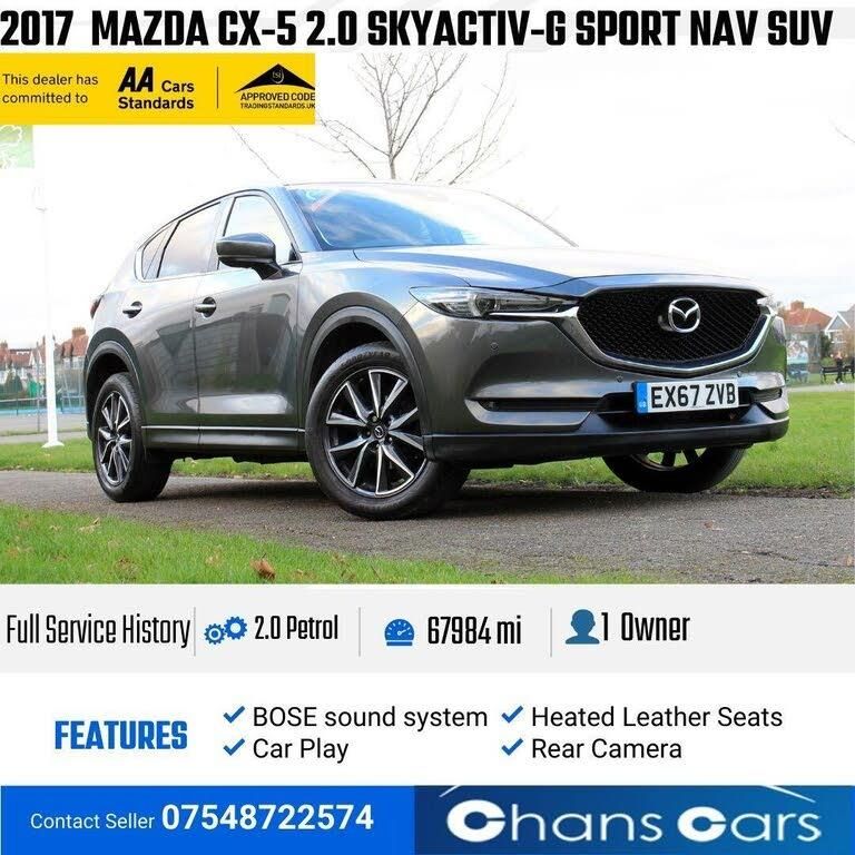 chans carsAre Proud To offer You This Fine 2017 Mazda CX-5 2.0 SKYACTIV-G Sport Nav SUV 5dr Petrol Manual 67984 Miles, MOT--31/08/26 ,1 Owner From New , Car apple Play, Heated Leather cream Seats, Full Service history With 7 Service stamps , Auto light and Wiper, Cruise Control, Bluetooth, Digital Dual Zone, Climate Control, Front and Rear Parking Sensors and Rear view Camera ,Digital Display, L.E.D Daytime Running Lights, Stop /Start Technology, Bose Speakers, DAB Radio, Air Con , Seat Height Adjustment, Immobilizer ,Climate Control, Enjoy low interest rates and no admin fees on finance when you deal with us directly and Avoid admin charges!-FULL SERVICE HISTORY|1 OWNER-FREE 12 Months AA Break Down Cover (T&C App)