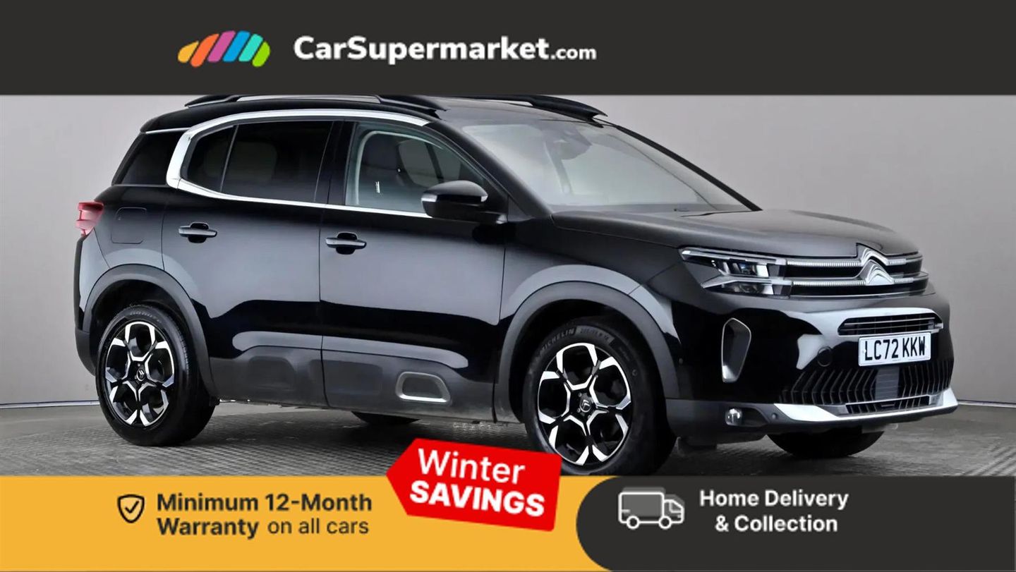 10" Touchscreen user interface with citroen connect nav, voice commands, Bluetooth handsfree and audio streaming,12.3" digital instrument cluster with customisable zones and colour schemes,Citroen connect box emergency assist system,Citroen connect play featuring android auto and apple carPlay,Electric power steering,Multi function trip computer,Advanced comfort suspension,Auxiliary input socket,FM and DAB digital radio, 6 speakers,Polyphonic sounds,USB A socket (charge only) on rear part of central console,3rd brake light,Acoustic laminated front side windows,Acoustic laminated windscreen with rain and brightness sensors,Automatic hazard light activation upon heavy brake application,Automatic headlights with welcome and goodbye lighting,Body colour door handles,Body colour front bumper with air curtain, silver painted skid plate, and matt black lower section,Body colour rear bumper,Electric heated and folding door mirrors with LED approach lighting and blind spot monitoring indicators,Electrochrome auto dimming interior rear view mirror,Front fog lights with static cornering function,Gloss black longitudinal roof bars,Glossy black door mirrors,Glossy black structured grille,LED headlights with LED daytime running lights and visual signature,LED rear lights with visual signature,Magic wash automatic windscreen wipers with flat blades, variable speed depending on vehicle speed, and windscreen washers integrated into the wipers,Radio aerial integrated into rear window,Rear side wing doors,Rear window wiper with intermittent facility, linked to reverse gear,Sequential electric front and rear side windows with anti pinch function,Stainless steel front door thresholds,Stainless steel window finishers,Tinted row 1 windows and dark tinted row 2, C-Pillar and tailgate windows,12V power outlet and 2x USB-A sockets (1x charge+data, 1x charge only) on front part of central console,12V socket in boot,2 Position boot floor,3 point ISOFIX mountings on front passenger and rear outer seats,4 way adjustable steering column,6-way electric adjust driver seat,Adjustable headrests (2 in front, 3 in rear),Advanced comfort front and rear seats,Aluminium pedals and foot rest,Automatic bi-zone air conditioning with active carbon filter and air quality system, plus controllable row 2 air diffuser,Boot light,Central storage box with opening central armrest and interior lighting,Dashboard storage area to right of driver,open storage at front of central console,glovebox with smooth opening and lighting,e-Toggle automatic gearbox selector,Front door storage can hold 1.5 litre bottle and A4 size documents, B-pillar coat hooks,rear door storage,central storage under armrest,Manual driver lumbar adjustment,Manual front passenger seat adjustment (height, slide, backrest angle),Map pockets in rear of front seats,Multi function leather steering wheel with two command blocks,Single front passenger seat,Three individual sliding seats with adjustable backrest and flat floor function,Two open cupholders with LED lighting in central console,Urban leather effect cloth/Alcantara upholstery with black ambience,City camera pack with front and rear parking sensors - C5 Aircross,Drive assist pack - C5 Aircross,LED interior lighting - - C5 Aircross,3 rear 3-point seatbelts (outer seats featuring force limiters),ABS/EBD,Adaptive driver and front passenger airbags with passenger airbag deactivation function,Collision risk alert,Driver and front passenger side airbags,DSC (Dynamic Stability Control) and ASR (Electronic Anti-skid System),Electronic parking brake,ESP including traction control and stability programme,Front seat belts with double pretensioning, force limiters and height adjustment (driver and passenger),Front ventilated disc brakes and rear disc brakes,Head curtain airbags covering rows 1 and 2 (left and right),Hill start assist,Manual child lock in second row,Seatbelt unfastened audible alert,Two tone horn,Tyre under inflation indicator,Anti theft alarm with perimetric and volumetric protection, plus tilt sensor,Anti theft locking wheel nuts,Automatic door and tailgate locking with automatic unlocking in case of collision,Electronic code immobiliser,Keyless entry and start,Remote central locking + deadlocks,Compressor with puncture repair kit