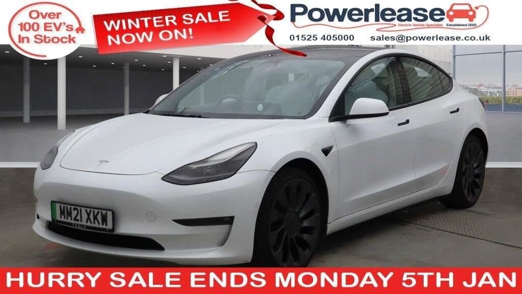 **93% BATTERY HEALTH** WHITE LEATHER ** This 2021 Tesla Model 3 Performance is a superb example, having had only one owner since new. As an electric vehicle with four wheel drive, it boasts an impressive 82 kWh battery offering a maximum range of 340 miles when new. Charging at home on a 7kW charger takes approximately 12 hours, while rapid public charging can replenish the battery from empty to 80% in as little as 26 minutes. Inside, you'll find a fixed panoramic glass roof, heated front seats, and two inductive charging mats for smartphones, alongside rear parking sensors and air conditioning for your comfort and convenience. The Performance variant truly shines with its exceptional acceleration, achieving 0-60mph in a remarkable 3.1 seconds. This performance capability, combined with its extensive electric range of 340 miles, positions this Model 3 as a standout choice compared to other vehicles in its class, offering both exhilarating driving dynamics and practical long distance potential. BATTERY HEALTH CHECK AVAILABLE ON REQUEST | SPECIALIST EV EXTENDED WARRANTIES | ALL VEHICLES FULLY INSPECTED | ALL VEHICLES SERVICED & MOT'ED | HPI CHECKED AND CERTIFIED | FINANCE AVAILABLE | PART EXCHANGE AVAILABLE | CLICK AND COLLECT AVAILABLE | HOME DELIVERY AVAILABLE | BUY ONLINE VIA OUR WEBSITE WWW.POWERLEASE.CO.UK | IN BUSINESS FOR OVER 20 YEARS EST 2000 |