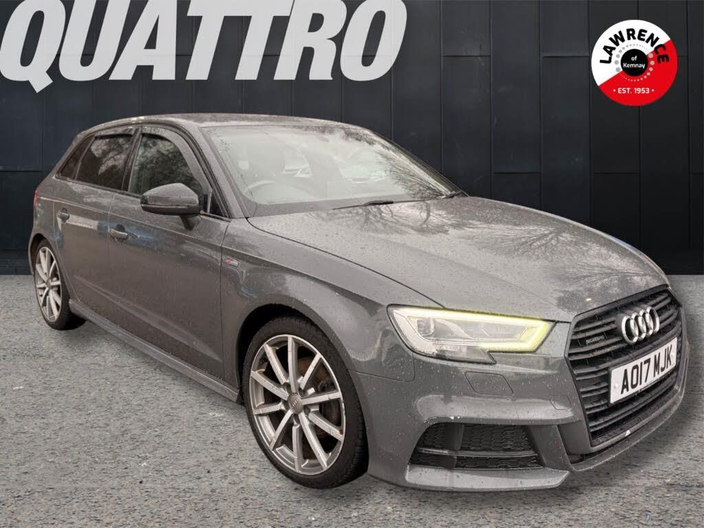 Audi connect, Audi drive select, Audi smartphone interface, Colour driver's information system display, Mobile telephone preparation - bluetooth interface, Service interval indicator, Speed limit display, Voice control system, Diesel particulate filter, 2 USB ports, Audi music interface, Auxiliary input socket, DAB Digital radio, Black door mirrors, Black window surrounds, Body colour bumpers with black insert, Body colour roof spoiler, Chrome exhaust tailpipes, Electric front windows, Electric operated/heated door mirrors, Electric rear windows, Heated windscreen washer jets, LED daytime running lights, Matt black radiator grille, Privacy glass, Rear wiper, S Line body styling, Sport specific side air inlet grille and diffuser insert, 3 adjustable rear headrests, 3 spoke flat bottomed multi-function leather steering wheel, 4 lashing points to secure luggage, Adjustable front armrest, Black cloth headlining, Dual zone electronic climate control, Front and rear interior lights with delay, Front passenger seat isofix location point, Front/rear floor mats, Height/depth adjustable steering column, Illuminated glovebox, ISOFIX child seat preparation+airbag deactivation, Jack and tool kit, Stainless steel pedals, Storage compartment in centre console, Storage compartment under front seats, Storage compartments in doors, Black styling pack - A3/S3, LED interior light pack - A3/RS3, Light and rain sensor pack - A3 Hatchback/Sportback, Storage and luggage pack - A3/RS3, 3 point seatbelts on all seats, ABS/EBD, Active bonnet, Active front headrests, ASR, Curtain airbags, Driver and passenger side airbags, Driver/Front Passenger airbags, Drivers knee airbag, EDL, Electromechanical parking brake, ESC - Electronic Stability Control + traction control, Front passenger airbag deactivation, Manual rear child locks, Multi-Collision braking, Seatbelt warning, Tyre pressure monitor, Warning triangle and first aid kit, Anti theft alarm, Anti-theft wheel bolts, Remote control central locking, Thatcham category 1 alarm + immobiliser, Aluminium air vent surrounds, Aluminium trim elements, 18" 10 spoke design alloy wheels in matt titanium look with diamond cut finish, Space saver spare wheel