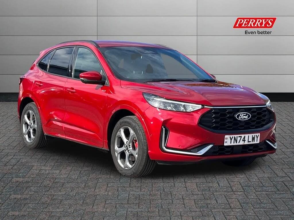 12.3" digital colour instrument cluster,360 degree view camera,Clear exit assist,Cross traffic alert with active braking,e-Call (emergency call),Ford easy fuel,Ford SYNC 4 Navigation with 13" touchscreen, DAB radio, emergency assistance, Andriod Auto/Apple CarPlay, 5G modem & Ford Pass connect,Front and rear parking sensors,Hands free power tailgate,Lane centering assist,Lane keeping aid with lane departure warning,Power assist steering,Selectable drive modes,Service interval indicator,Sports suspension,Auto headlamps with high and low beam,Black roof rails,Body colour bumpers,Front LED fog lamps,Large rear spoiler,LED daytime running lights,LED rear lights,LED third brake light,Pop out door edge protectors,Power front/rear windows with global close,Power heated folding door mirrors with puddle lights, memory function and camera,Quickclear heated windscreen,Rain sensing wipers,Rear privacy glass,Rear side wing doors,Rear wiper,ST-Line body styling kit,2nd row sliding seats,Electronic automatic temperature control (EATC),Front and rear head restraints,Partial premium touch sensico upholstery,Rear centre head restraint,Single front passenger seat,Sports seats,Driver assistance pack - Kuga Auto,3x3 point rear seatbelts,Airbags - front driver/passenger, front and rear curtain,Drivers knee airbag,Dynamic brake support,Electronic stability control (ESC) and ABS,Evasive steering assist,Ford MyKey Gen 2 safety system,Manual child proof rear door locks,Pre collision assist with autonomous emergency braking,Rear seat Occupancy alert,Red brake calipers,Tyre pressure monitoring system,Engine immobiliser,Keyless entry and Ford power start button (Keyless start),Locking wheel nuts,Remote powered central double locking doors,Thatcham category 1 alarm,High performance (700W) B&O premium audio system with enhanced sound tuning, 10 speakers including upgraded door speakers, subwoofer and 2 USB ports,Mini Spare Wheel,Winter Pack