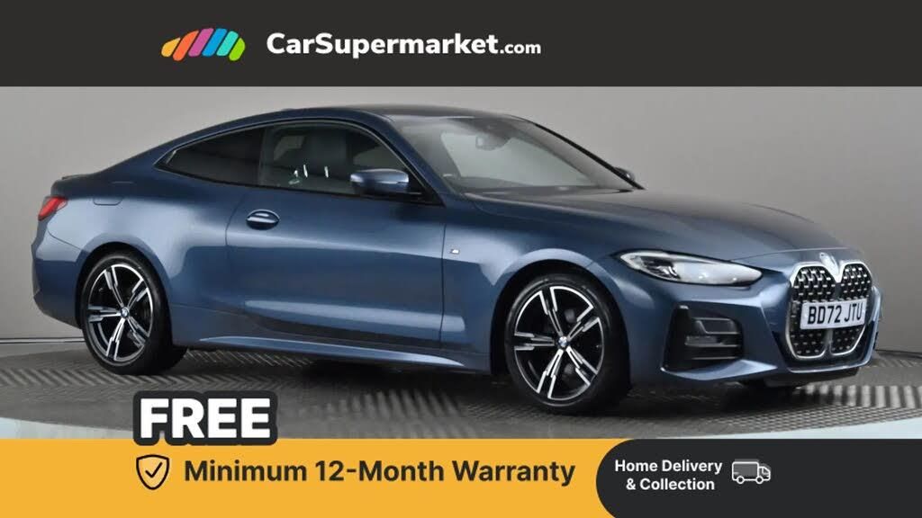 Active guard plus,Attentiveness assist,Auto start-stop,BMW ConnectedDrive online services,BMW iDrive controller on centre console,BMW Live Cockpit Professional Nav with 12.3" instrument display + 10.25" display, Intelligent Voice Assist, BMW OS 7, HDD, 2USB, 4G LTE connect,BMW service history,BMW Teleservices,Brake pad wear indicator in front and rear,Check Control warning system for monitoring of lights and door/luggage compartment open warning,Condition based service,Cruise control with speed limit function,Electric power steering with Servotronic steering optimised at all speed ranges,Gearshift time display in manual mode,Instrument cluster with speedometer with mph readout, tachometer, fuel gauge and oil temperature gauge,Integrated owners handbook,Oil sensor for level and grade, warning by check control system,On board computer - average speed, fuel consumption, outside temp display with acoustic warning, clock/date, service interval, odometer/trip meter,Optimum shift indicator,Run flat indicator,Shifting point display,Touch control functionality for BMW Live Cockpit Professional Nav,Variable sport steering,8 speed automatic steptronic transmission with gearshift paddles,Balanced 50/50 weight distribution,Double joint spring strut front axle,Double VANOS,Drive performance control - ECO PRO, comfort and sport modes,High precision injection,Low centre of gravity,M sport suspension,Petrol Particulate Filter,Stroke dependent dampers,VALVETRONIC engine management,2x USB Type C ports in front centre console for charging and data transfer,2x USB Type C ports in rear centre console for charging,DAB tuner,Electronic service booklet,Acoustic glazing,Automatic headlight beam throw control with load dependent regulating reaction, dynamic compensation of braking dive and acceleration squat,Automatic windscreen wipers and automatic headlight,Automatically dimming electrochromatic rear view mirror,BMW emblem on engine compartment lid and tailgate,BMW kidney grille with mesh grille front side of the nuggets in matt aluminium and frame in chrome high gloss,Body colour fuel filler flap,Body colour roof fin,Brushed aluminium inserts in the front door sill finishers with BMW designation,Door sill strips,Dynamic brake lights,Electric windows - front and rear, with open/close fingertip control, anti trap facility and comfort closing function all round,Exterior mirrors - electrically folding with anti-dazzle,Fading support,Follow me home headlights,Front and rear bumper system,Front apron plastic in body colour,Green tinted heat protection glazing,High gloss shadow line exterior trim,Illuminated bow type door handles in body colour drivers side with door lock,Interior rear view electrochromatic mirror with automatic anti dazzle function,LED daytime running lights,LED front fog lights,LED front indicators,Licence plate panel integrated into front bumper and tailgate,Lightweight engineering,M designation on front side panels, left and right,M rear boot spoiler,Model designation on right side of tailgate,One piece front bumper cover including towing eye cover in body colour,Preparation for high beam assistant,Rear boot,Reversing light,Side frame decorative moulding black matt,Two part LED tailights in L-shape with components in smoked glass, brake light, LED turn indicator and rear fog light,Visible exhaust tailpipe finisher,Visible VIN plate,Welcome lights in interior and door handle area,Widened track and increased camber values for max transverse dynamics, agility and steering precision,Window recess cover black high gloss,Windscreen wipers with integrated heated washing jets,12V power socket in front centre console,2 front cupholder in centre console with clamping elements and matt black inlay,2 Rear seat headrests,2 seat bench in second row,3 spoke M sport leather multifunction steering wheel,3 zone automatic air conditioning,4 pieces lashing eyelets in luggage compartment,40:20:40 split folding rear seat and rear centre armrest with two cupholders,Anthracite headlining,Armrest integrated in front and rear door trim + front centre console armrest,BMW ID,Driver seat backrest width adjustment,Four grab handles integrated in roof lining,Front and rear door pockets,Front and rear reading lights,Front sport seats,Heated driver and front passenger seats,Height adjustable front headrests,Height adjustable mechanically and infinitely variable steering column,Illuminated armrest storage compartment,Illuminated glove compartment with separate small compartment,Make-up mirror lights,Single front passenger seat,Storage compartment in rear centre console,Sunvisors with illuminated vanity mirrors and ticket pocket,Toolkit located in luggage compartment,Vernasca leather upholstery,Ambient lighting pack - 4 Series,Connected professional pack - 4 Series,M sport exterior styling pack - 4 Series,2 x 3-point rear seatbelts,Battery safety cut-off,BMW emergency call,Brake energy regeneration,Braking pre-tensioning