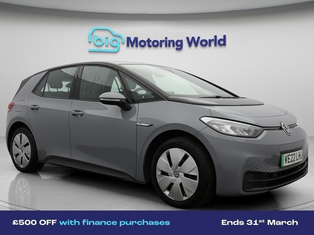 £500 towards your finance depo-Our Volkswagen ID.3 is finished in Grey. Specification includes a range of fantastic features including £500 towards your finance deposit, Apple CarPlay, Adaptive Cruise Control, Lane Assist, Android Auto, Satellite Navigation, Privacy Glass, Heated Seats, Gesture Control, Heated Steering Wheel Specification information is supplied by CAPHPI and may vary to the actual car. This data does not form any part of a buying contact. Please check specification prior to purchase in-store. The MOT is valid until January 2027, visit bigmotoringworld.co.uk for more photos, a 360 tour, service history and a free HPI report.Were BIG on peace of mind and this Grey Volkswagen ID.3 has completed our comprehensive 200 point inspection and passed all checks. Its ready for you to drive away with immediate collection in-store. We include a 90-day warranty as standard plus an option to extend for up to 3 years.Reserve this car exclusively for you, safely and securely at bigmotoringworld.co.uk, with a fully refundable £99 deposit. Test drive before you buy, with no commitment, no hassle and a completely haggle free experience. Still searching and want to see thousands more cars? We are BIG on choice with over 8000 cars to choose from.Visit our award winning web site bigmotoringworld.co.uk.Were Big Motoring World and were BIG on what matters to you.